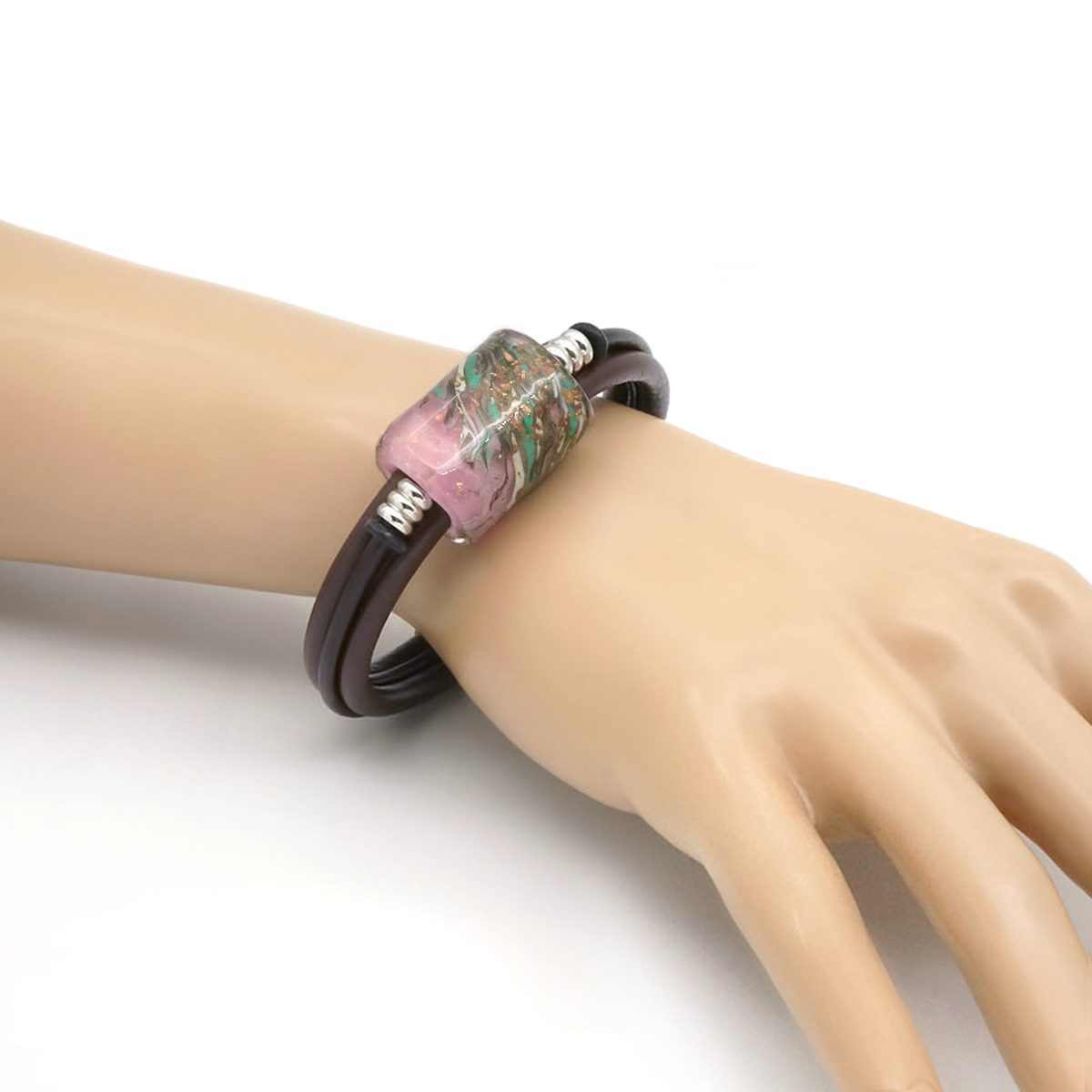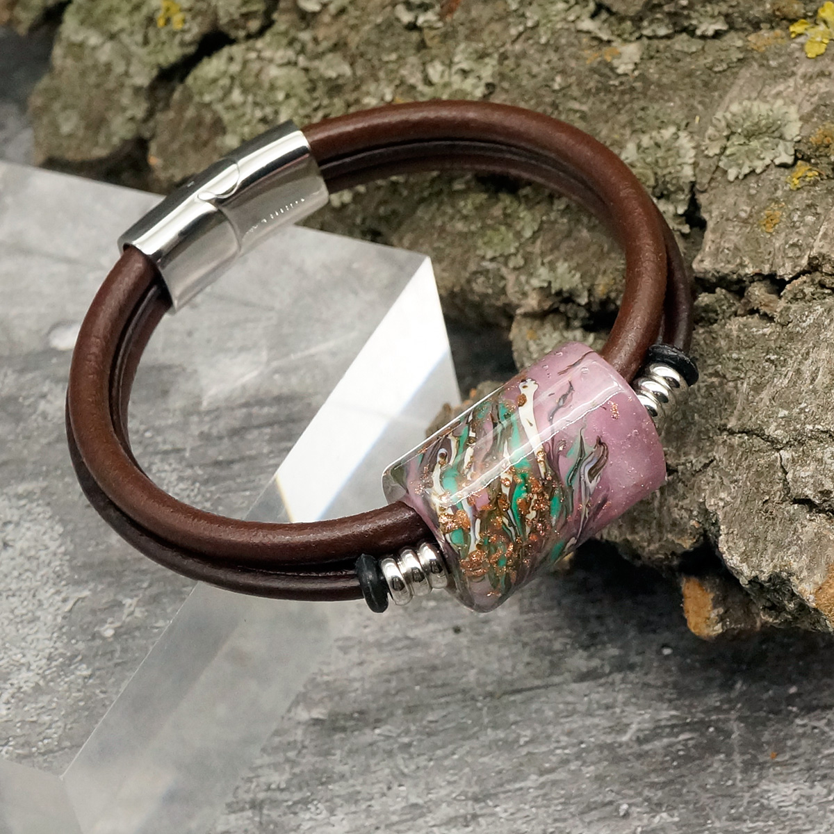 Браслет изготовлен из муранского стекла, натуральной кожи и гипоаллергенной ювелирной стали, что очень важно для людей с чувствительной кожей. Металл не темнеет и не подвергается воздействиям окружающей среды, надолго обеспечивая красивый внешний вид изделия. Крепкий магнитный замок с двойной защитой надежно фиксируется на запястье. Ширина браслета - 1,5 см. Размер стеклянной бусины - 1,9x2,5 см. Вес - 27 гр.