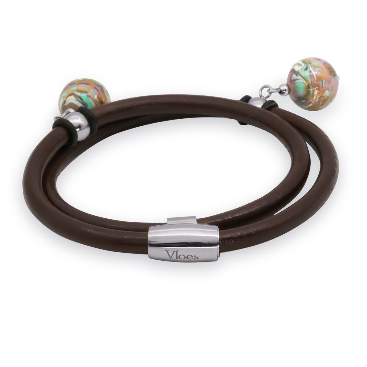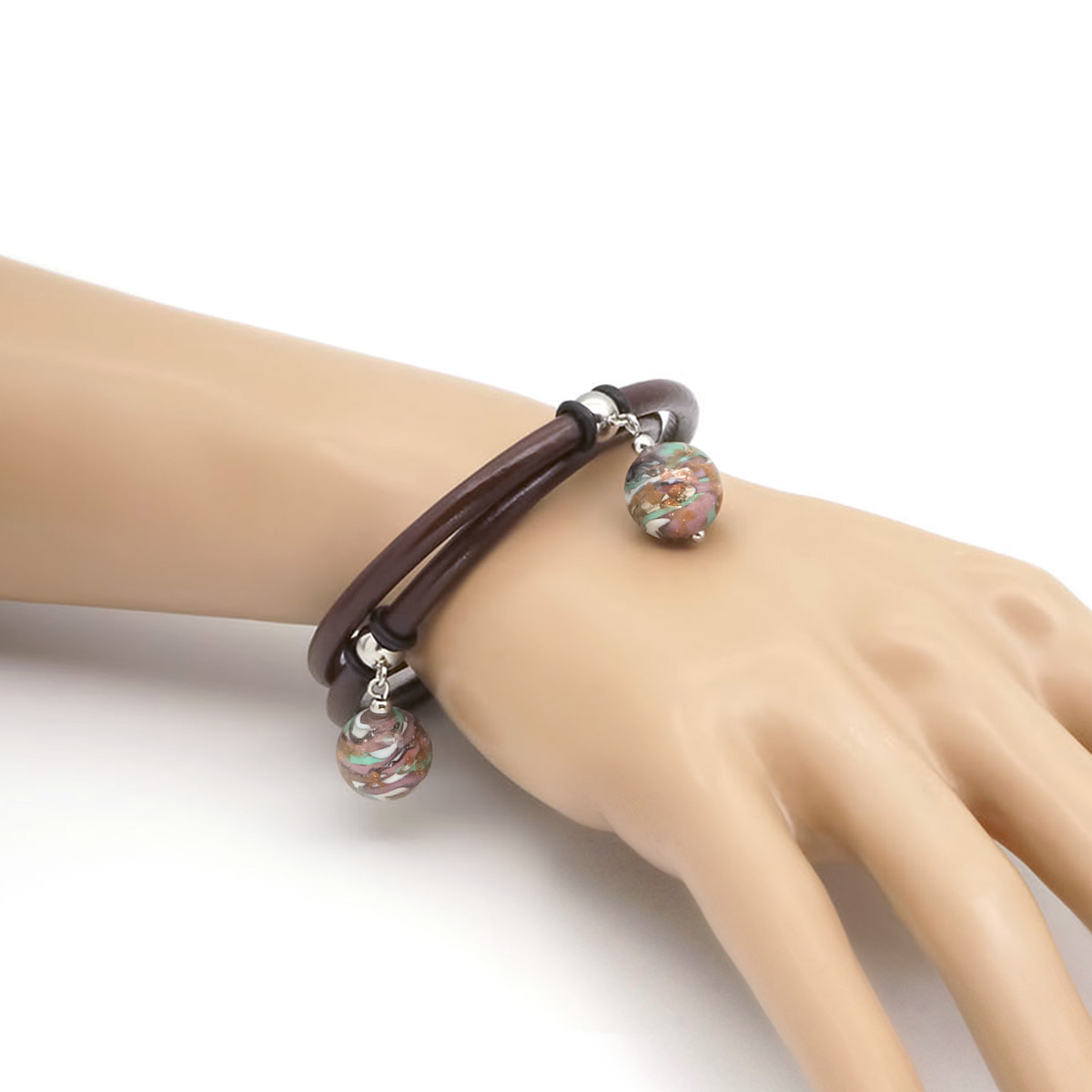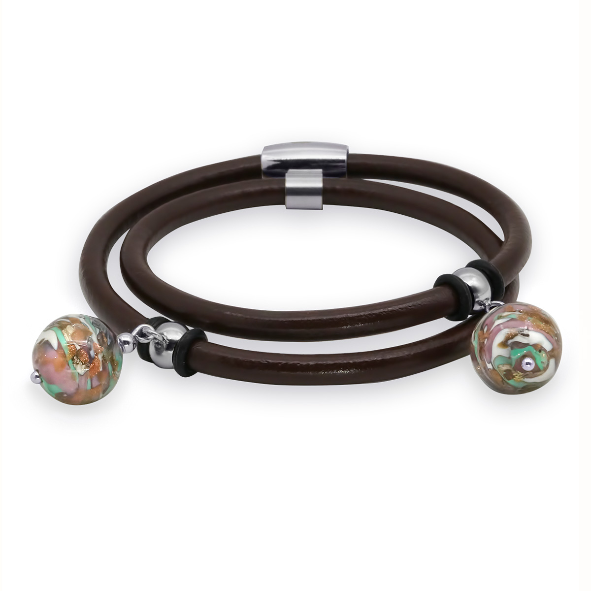 Браслет изготовлен из муранского стекла, натуральной кожи и гипоаллергенной ювелирной стали, что очень важно для людей с чувствительной кожей. Металл не темнеет и не подвергается воздействиям окружающей среды, надолго обеспечивая красивый внешний вид изделия. Крепкий магнитный замок надежно фиксируется на запястье. Ширина браслета - 1 см. Диаметр стеклянных шариков - 1,2 см. Вес - 15 гр.