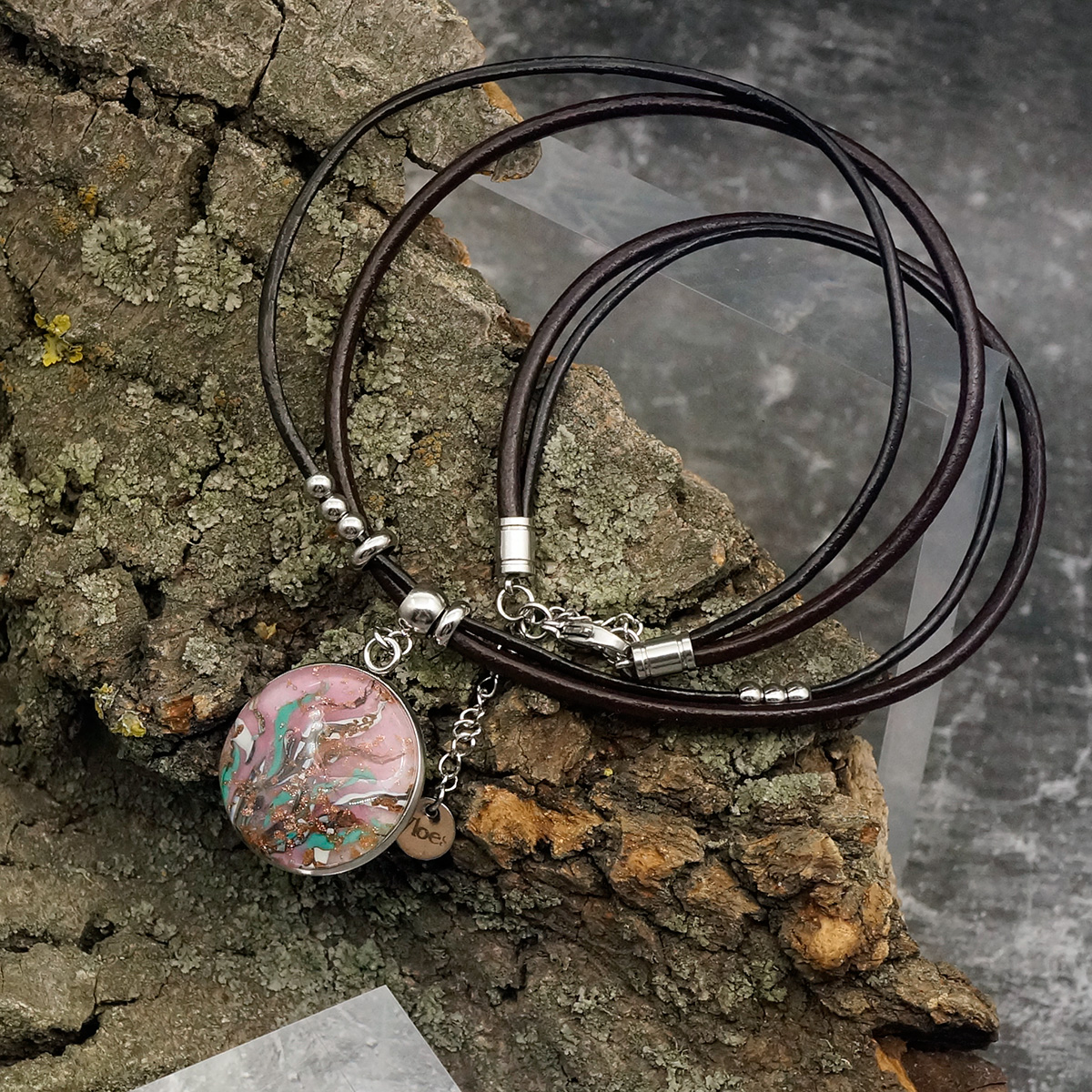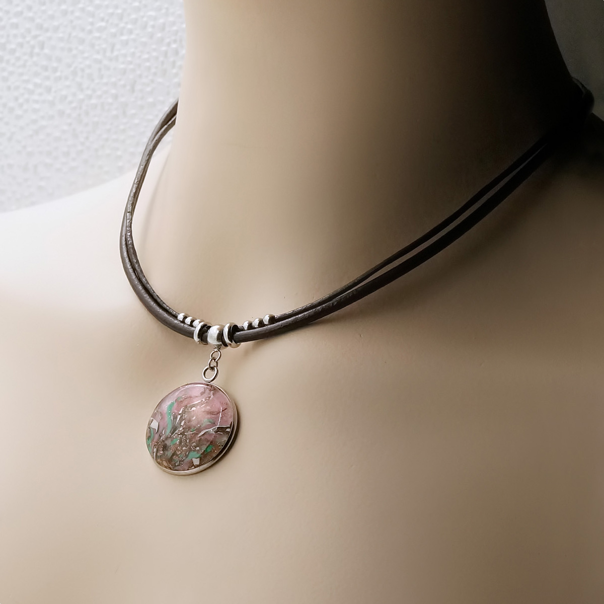 Колье изготовлено из натуральной кожи, муранского стекла и гипоаллергенной ювелирной стали, что очень важно для людей с чувствительной кожей. Металл не темнеет и не подвергается воздействиям окружающей среды, надолго обеспечивая красивый внешний вид изделия. Длина колье - 46 см + 5 см. удлиняющая цепочка. Диаметр стеклянного элемента - 2,5 см. Вес - 16 гр.