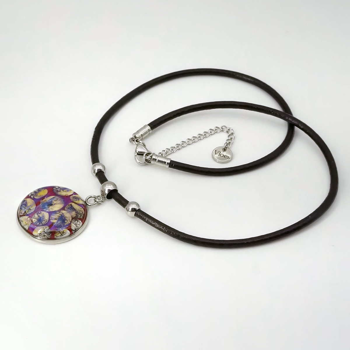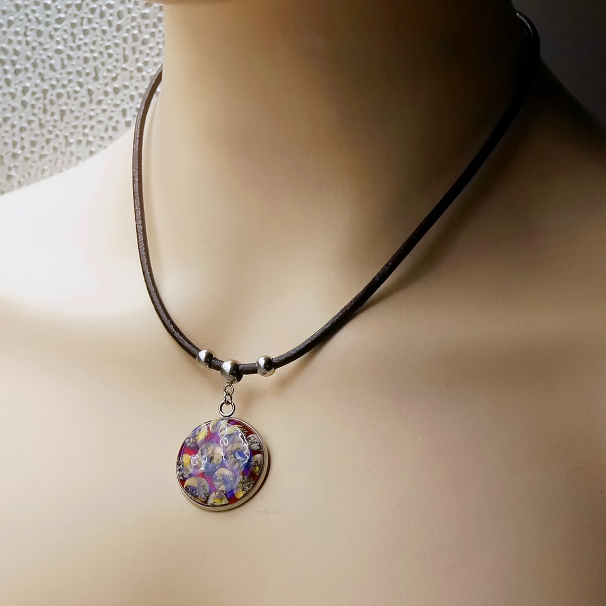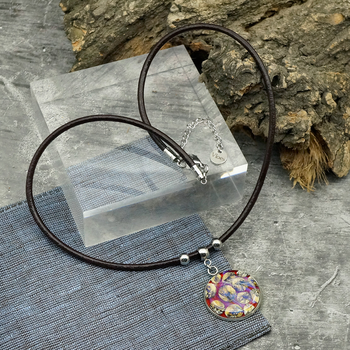 Колье изготовлено из натуральной кожи, муранского стекла и гипоаллергенной ювелирной стали, что очень важно для людей с чувствительной кожей. Металл не темнеет и не подвергается воздействиям окружающей среды, надолго обеспечивая красивый внешний вид изделия. Длина колье - 46 см + 5 см. удлиняющая цепочка. Диаметр стеклянного элемента - 2,5 см. Вес - 15 гр.