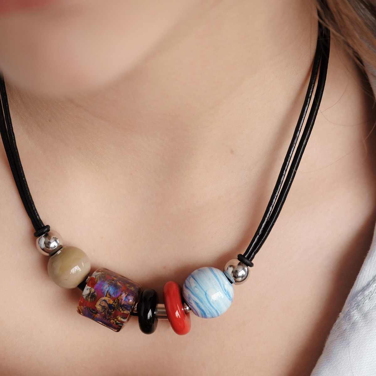 Колье изготовлено из натуральной кожи, муранского стекла и гипоаллергенной ювелирной стали, что очень важно для людей с чувствительной кожей. Металл не темнеет и не подвергается воздействиям окружающей среды, надолго обеспечивая красивый внешний вид изделия. Длина колье - 46 см + 5 см. удлиняющая цепочка. Размер стеклянных бусин - 2х1,5; 1,5х0,5 и 2х0,5 см. Диаметр шаров - 1,2 и 1,8 см. Вес - 45 гр.