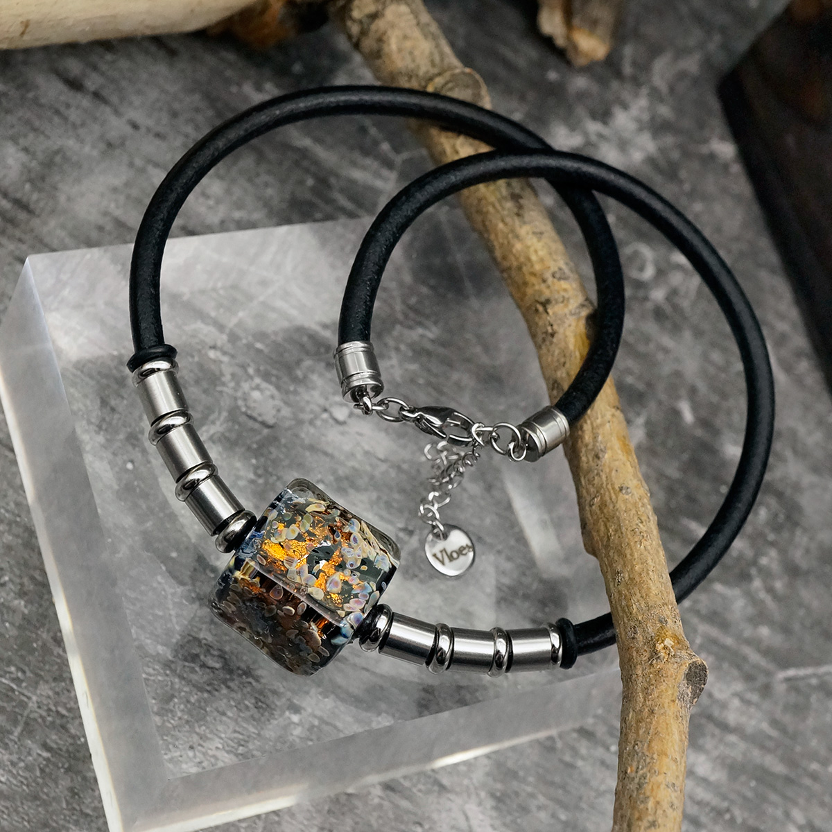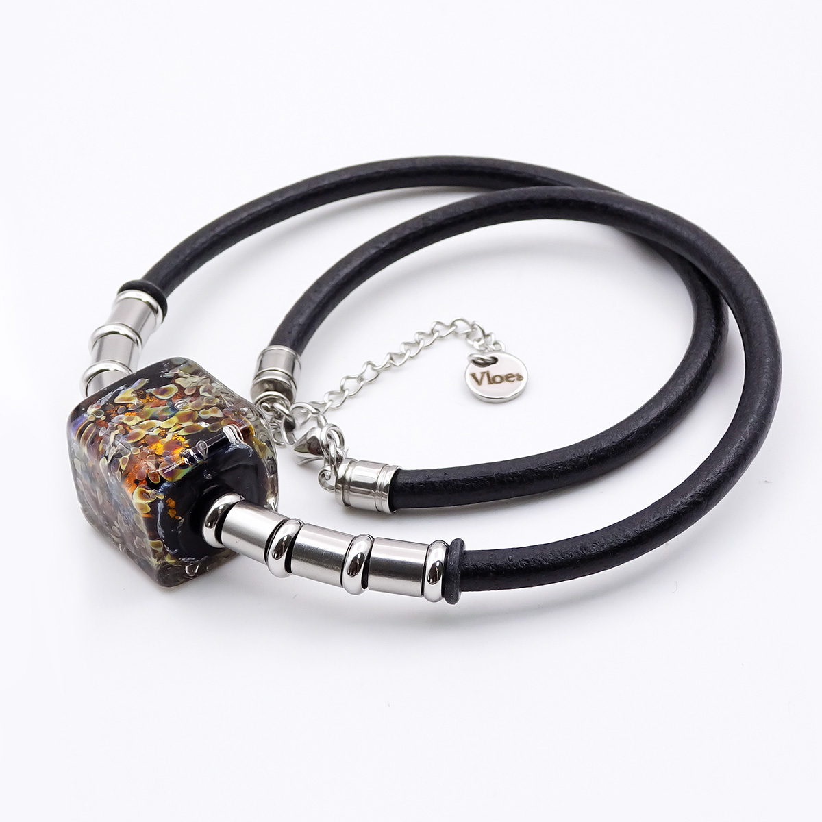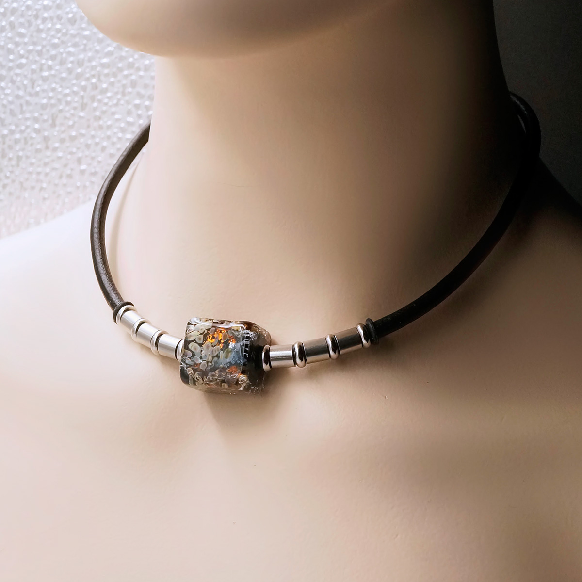 Колье изготовлено из натуральной кожи, муранского стекла и гипоаллергенной ювелирной стали, что очень важно для людей с чувствительной кожей. Металл не темнеет и не подвергается воздействиям окружающей среды, надолго обеспечивая красивый внешний вид изделия. Длина колье - 46 см + 5 см. удлиняющая цепочка. Размер стеклянной бусины - 2х2 см. Вес - 26 гр.