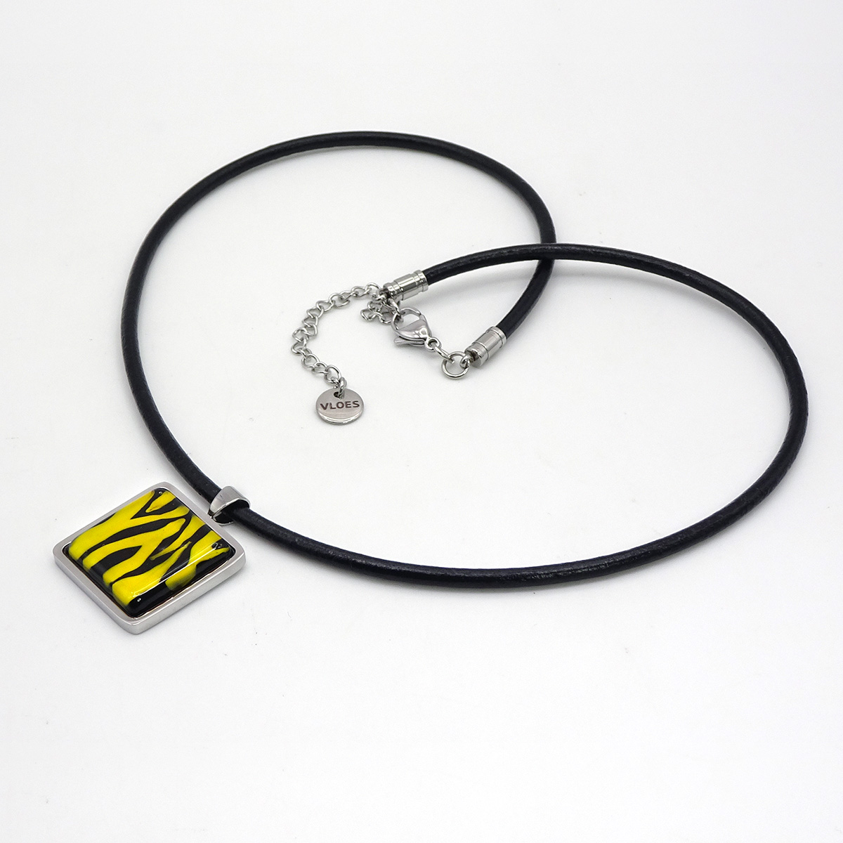 Колье изготовлено из натуральной кожи, муранского стекла и гипоаллергенной ювелирной стали, что очень важно для людей с чувствительной кожей. Металл не темнеет и не подвергается воздействиям окружающей среды, надолго обеспечивая красивый внешний вид изделия. Длина колье - 46 см + 5 см. удлиняющая цепочка. Размер стеклянного элемента - 2*2 см.  Вес - 15 гр.
