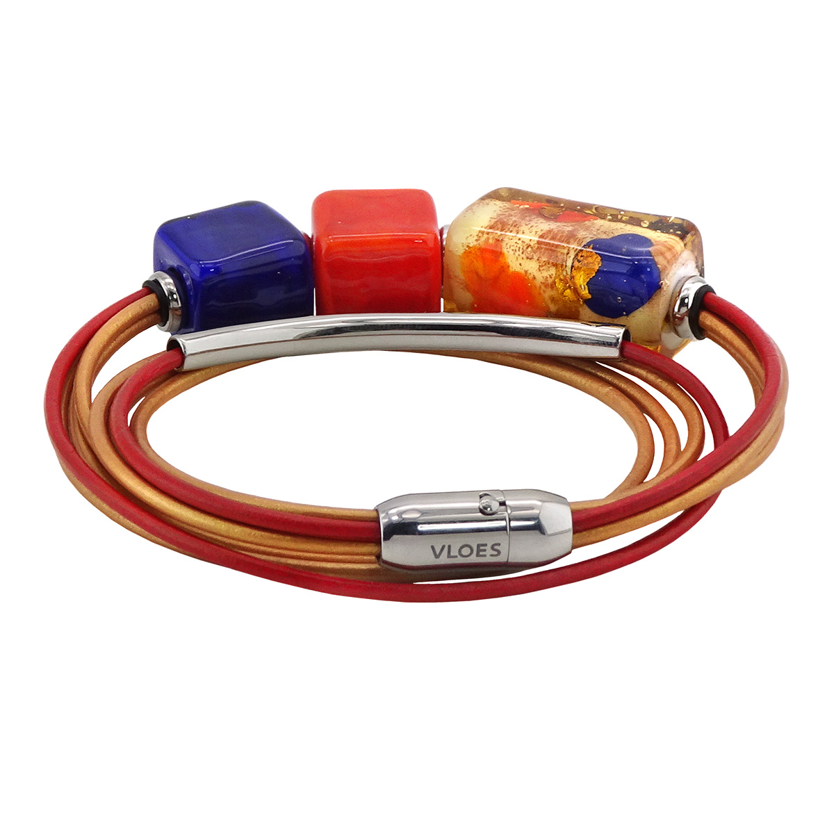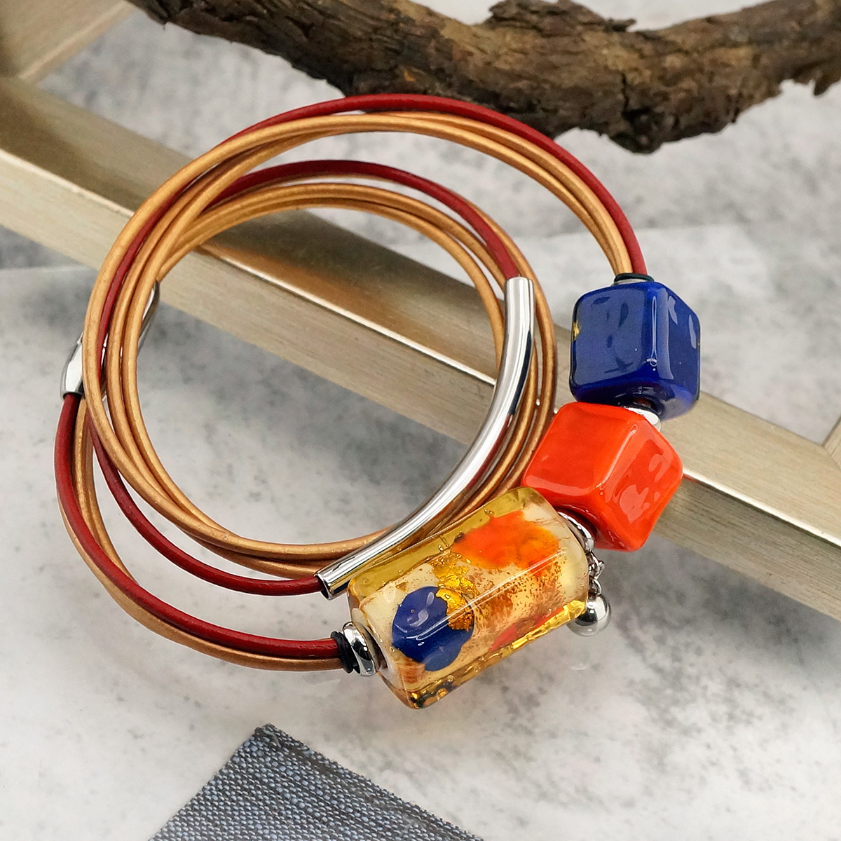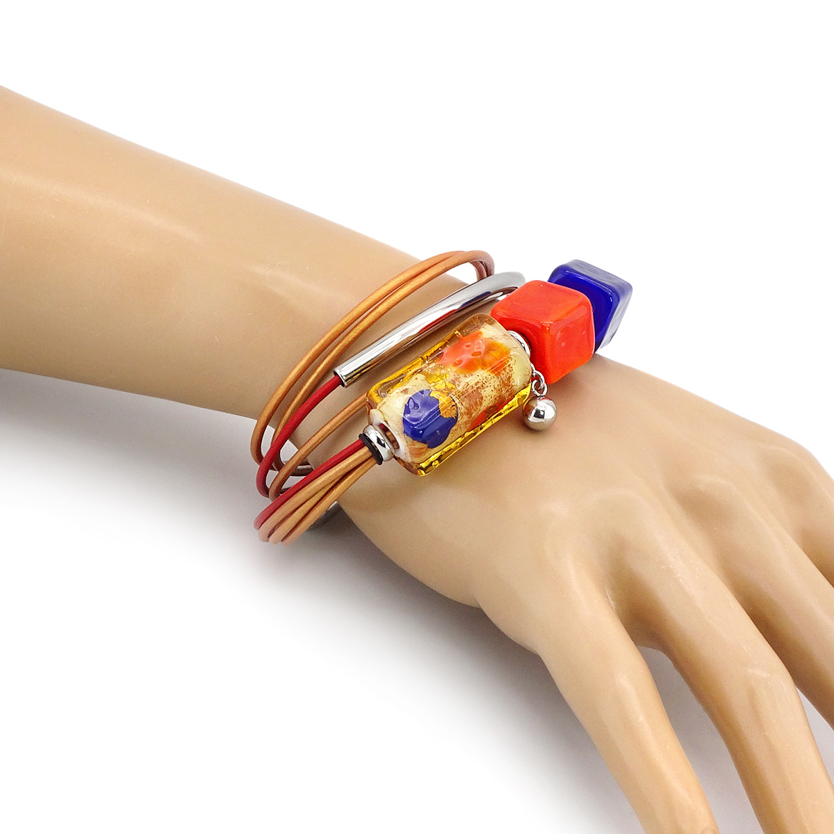 Браслет изготовлен из муранского стекла, натуральной кожи и гипоаллергенной ювелирной стали, что очень важно для людей с чувствительной кожей. Металл не темнеет и не подвергается воздействиям окружающей среды, надолго обеспечивая красивый внешний вид изделия. Крепкий магнитный замок с двойной защитой надежно фиксируется на запястье. Ширина браслета - 1 см. Размер регалиса - 2,4*1,4,   стеклянных кубов - 1,2 см. Вес -31 гр.