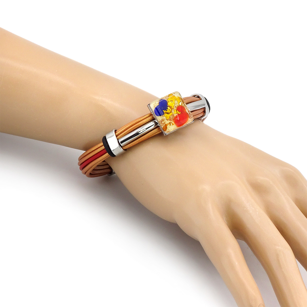 Браслет изготовлен из муранского стекла, натуральной кожи и гипоаллергенной ювелирной стали, что очень важно для людей с чувствительной кожей. Металл не темнеет и не подвергается воздействиям окружающей среды, надолго обеспечивая красивый внешний вид изделия. Крепкий магнитный замок с двойной защитой надежно фиксируется на запястье. Ширина браслета - 1,5 см. Диаметр стеклянного элемента - 2 см. Вес - 21 гр.