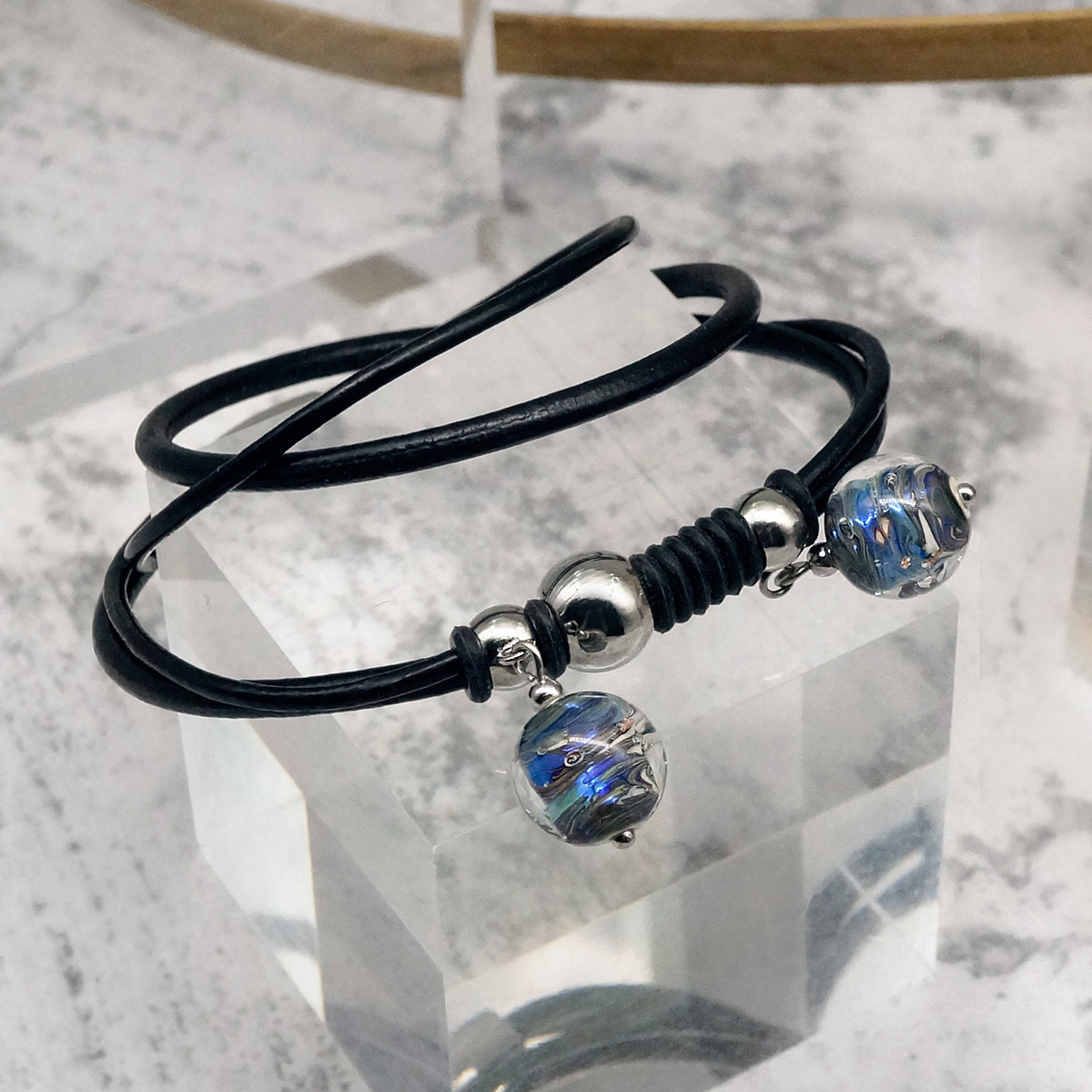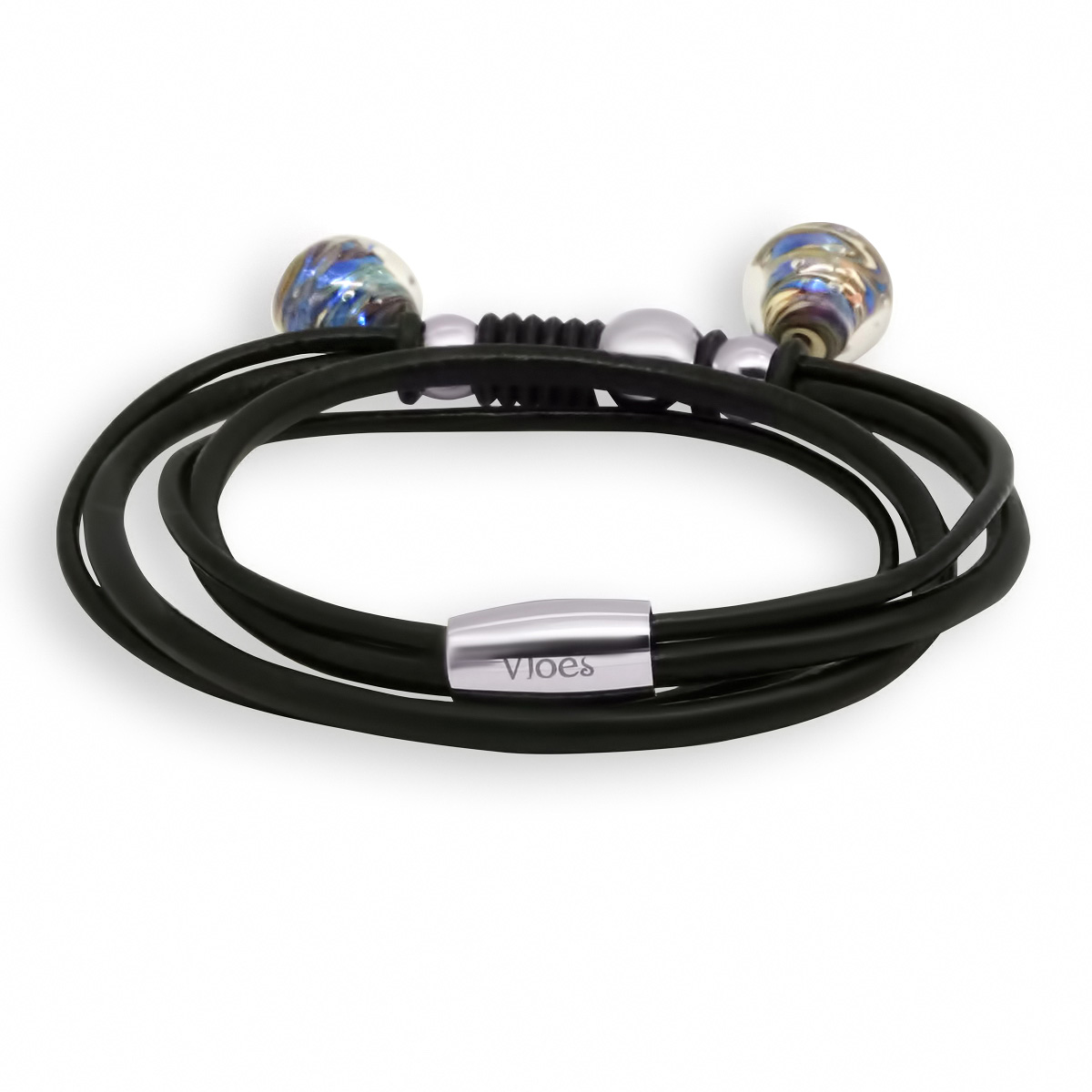 Браслет изготовлен из муранского стекла, натуральной кожи и гипоаллергенной ювелирной стали, что очень важно для людей с чувствительной кожей. Металл не темнеет и не подвергается воздействиям окружающей среды, надолго обеспечивая красивый внешний вид изделия. Крепкий магнитный замок надежно фиксируется на запястье. Ширина браслета - 1 см. Диаметр стеклянных шариков - 1,2 см. Вес - 20 гр.