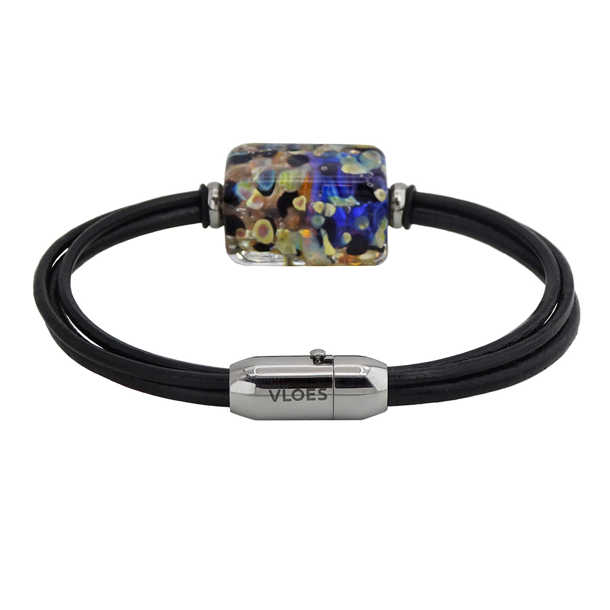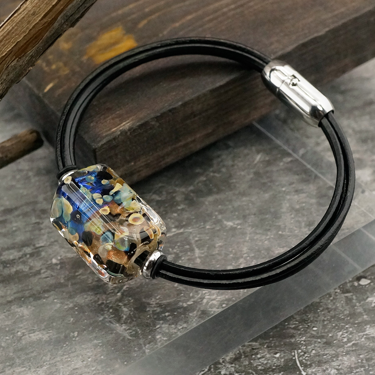 Браслет изготовлен из муранского стекла, натуральной кожи и гипоаллергенной ювелирной стали, что очень важно для людей с чувствительной кожей. Металл не темнеет и не подвергается воздействиям окружающей среды, надолго обеспечивая красивый внешний вид изделия. Размер стеклянной бусины - 2.4*1.4 см. Вес - 15 гр.