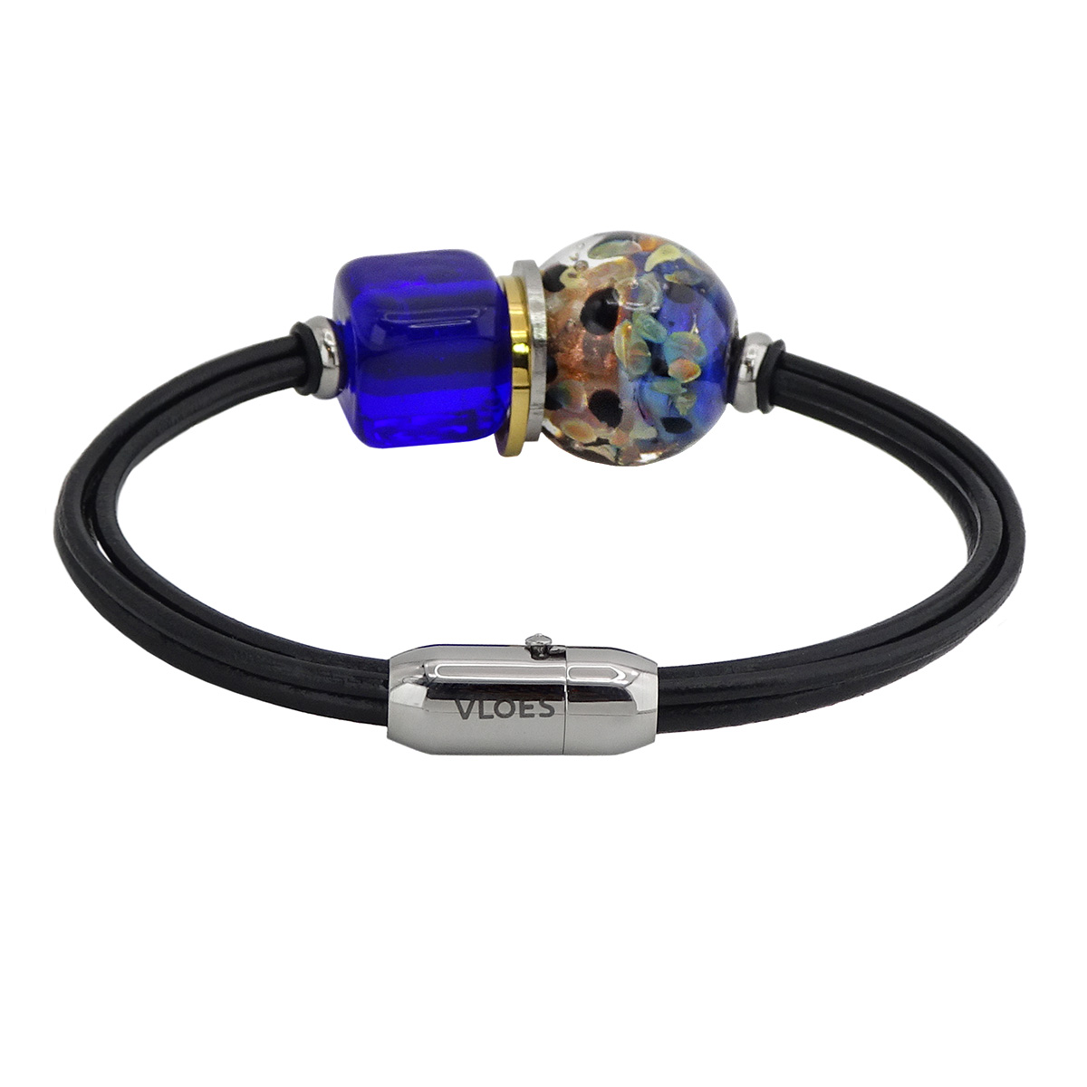Браслет изготовлен из муранского стекла, натуральной кожи и гипоаллергенной ювелирной стали, что очень важно для людей с чувствительной кожей. Металл не темнеет и не подвергается воздействиям окружающей среды, надолго обеспечивая красивый внешний вид изделия. Диаметр стеклянной бусины - 2 см, размер куба 1,5*1,5 см. Вес - 23 гр.