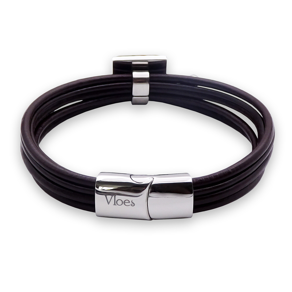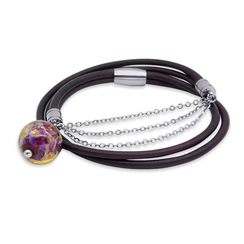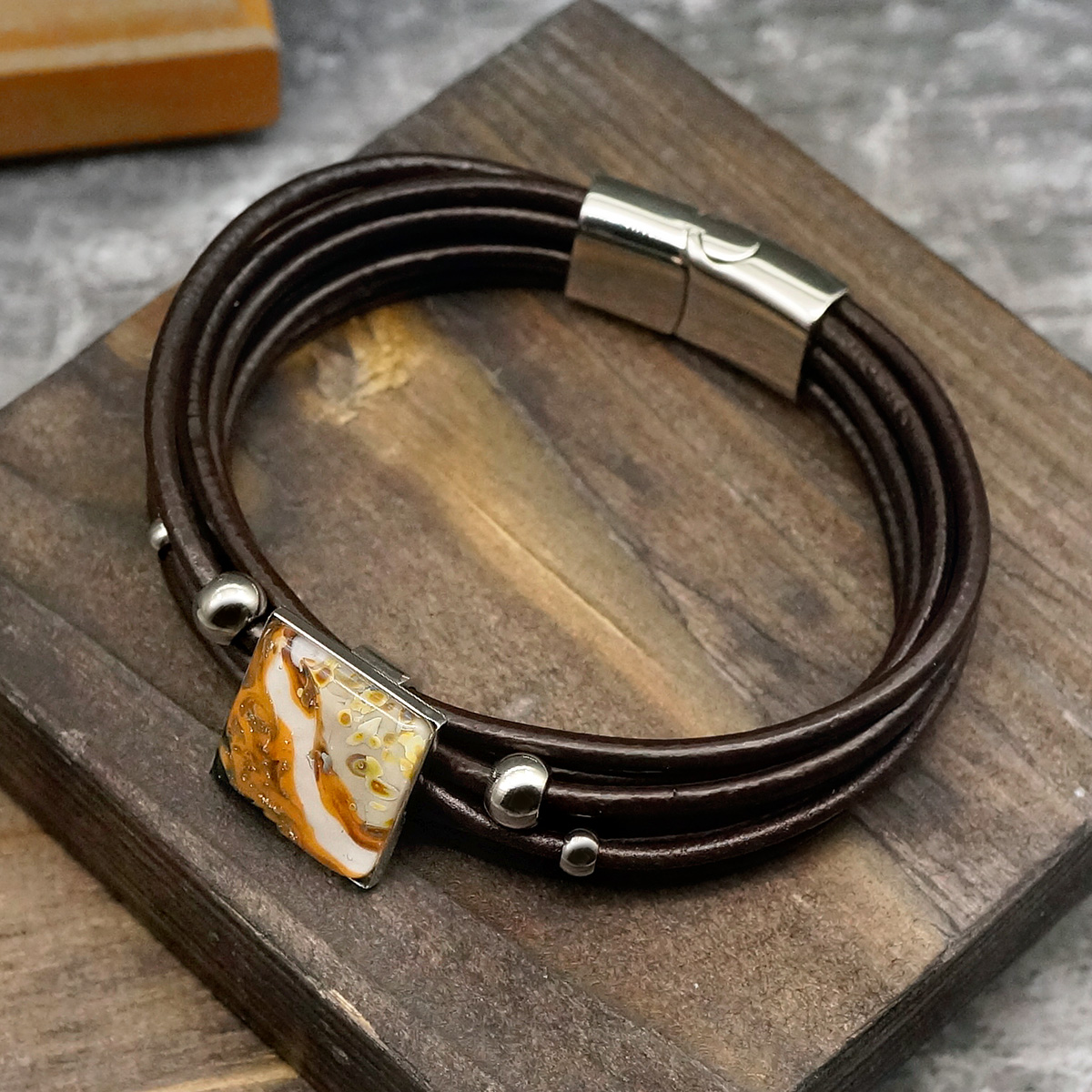 Браслет изготовлен из муранского стекла, натуральной кожи и гипоаллергенной ювелирной стали, что очень важно для людей с чувствительной кожей. Металл не темнеет и не подвергается воздействиям окружающей среды, надолго обеспечивая красивый внешний вид изделия. Крепкий магнитный замок с двойной защитой надежно фиксируется на запястье. Ширина браслета - 1,5 см. Размер стеклянного элемента - 1,6x1,6 см. Вес - 19 гр.