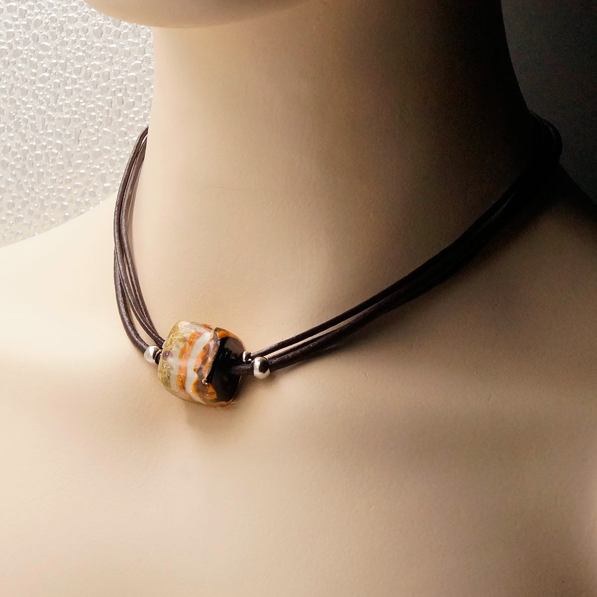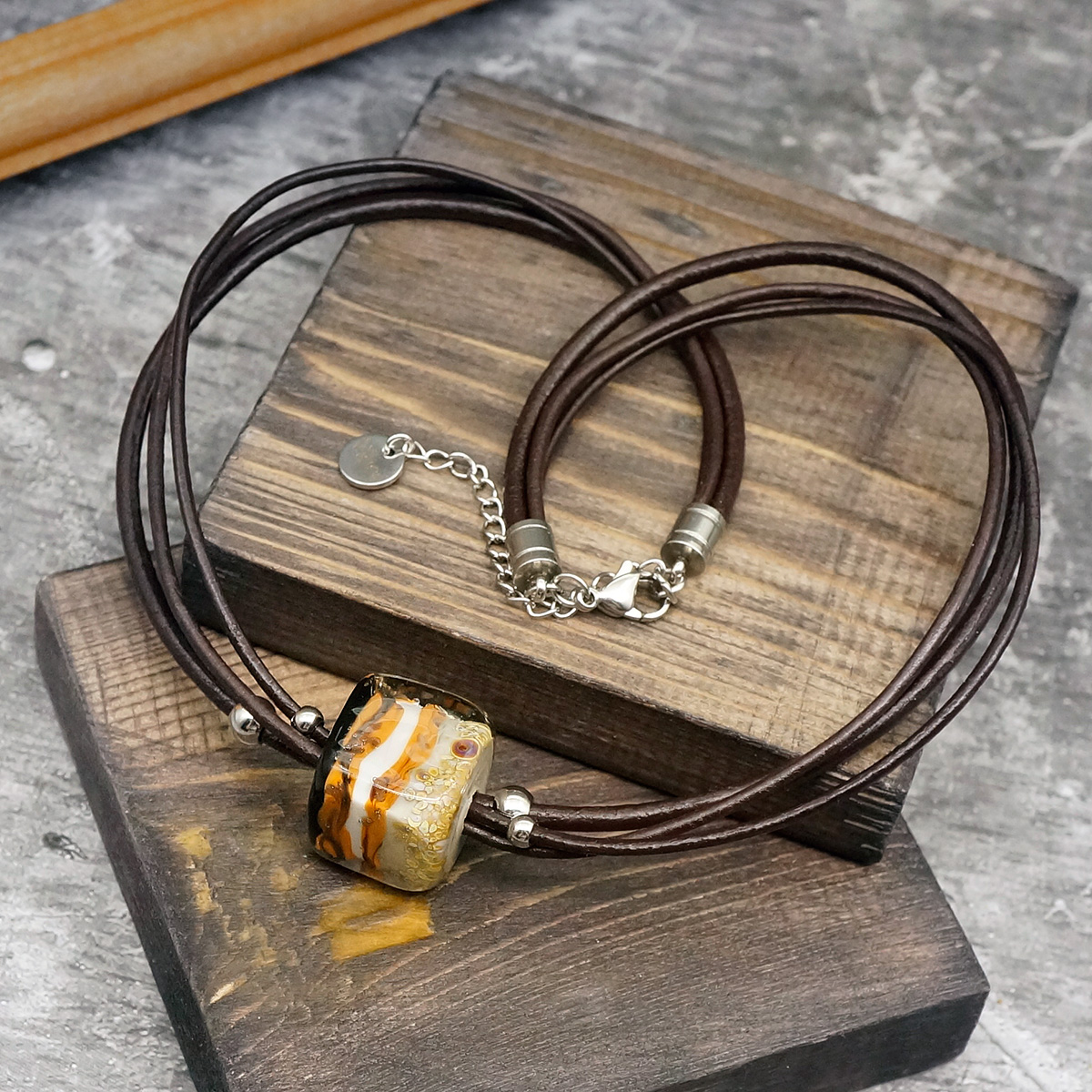 Колье изготовлено из натуральной кожи, муранского стекла и гипоаллергенной ювелирной стали, что очень важно для людей с чувствительной кожей. Металл не темнеет и не подвергается воздействиям окружающей среды, надолго обеспечивая красивый внешний вид изделия. Длина колье - 46 см + 5 см. удлиняющая цепочка. Размер стеклянного куба - 2х2 см. Вес - 22 гр.