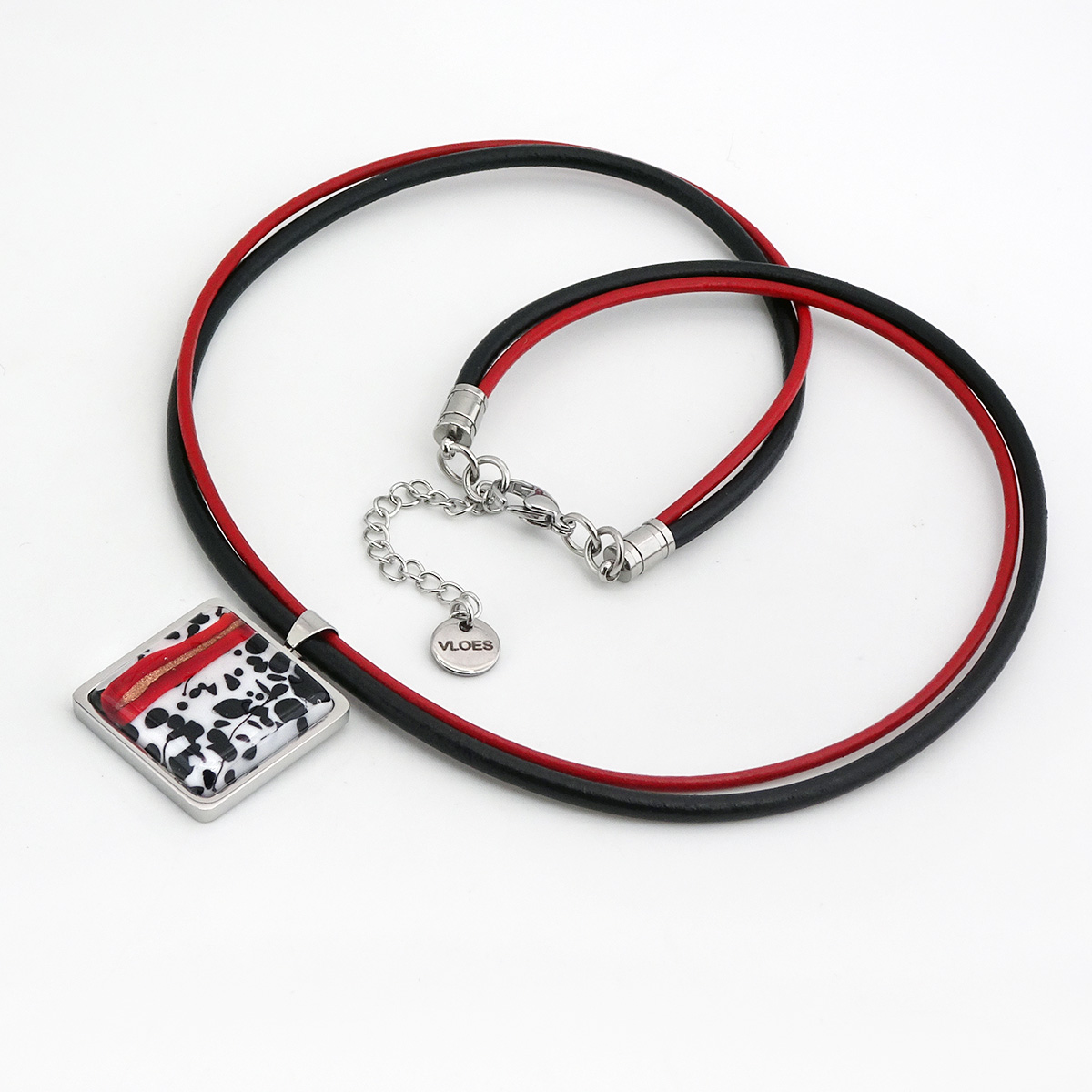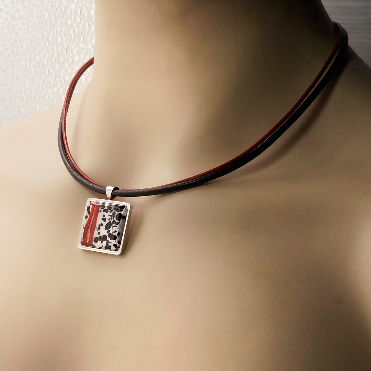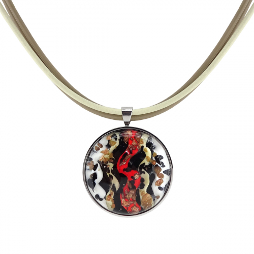 Колье изготовлено из натуральной кожи, муранского стекла и гипоаллергенной ювелирной стали, что очень важно для людей с чувствительной кожей. Металл не темнеет и не подвергается воздействиям окружающей среды, надолго обеспечивая красивый внешний вид изделия. Длина колье - 46 см + 5 см. удлиняющая цепочка. Размер стеклянного элемента - 2,2х2,2 см.  Вес -  20 гр.