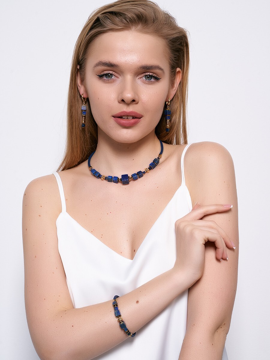 Лазурит, гематит,вулканическая лава, каучук, хруст.стекло, ювелирный сплав.Гальваническое покрытие:золото.