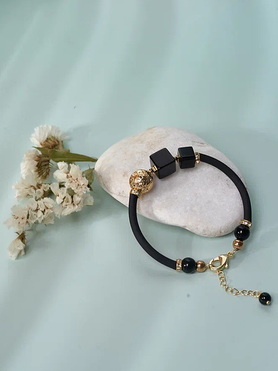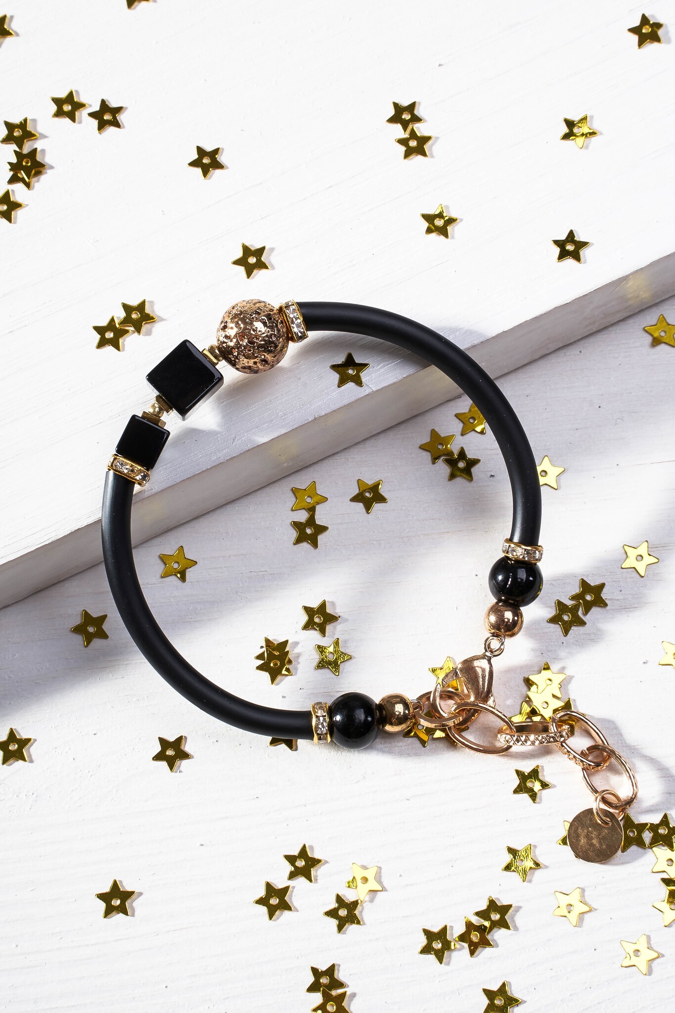 Агат, вулканическая лава, каучуковый шнурок, кристаллы Preciosa, латунь. Гальваническое покрытие: золото.