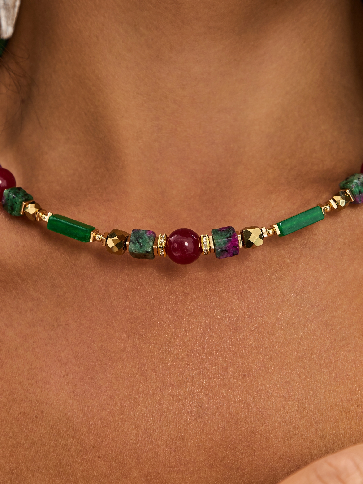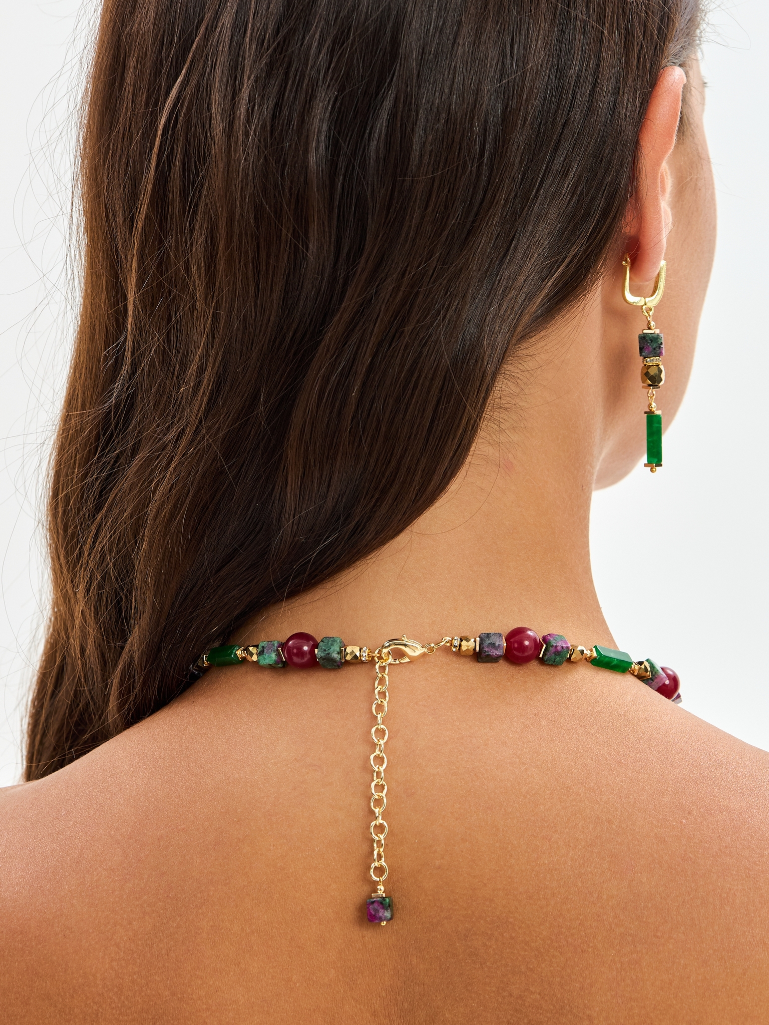 Циозит, кварц рубиновый, кварц зеленый, гематит, стразы, ювелирный сплав. Гальваническое покрытие : золото.