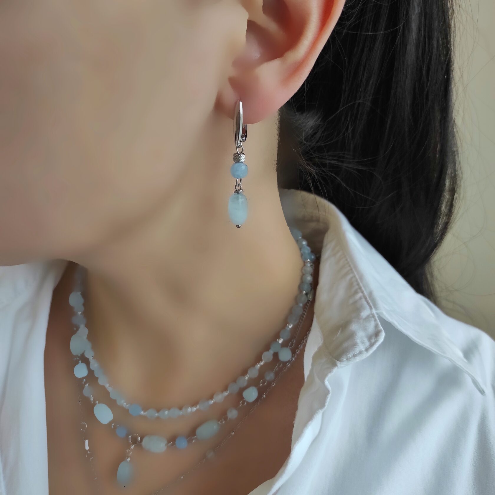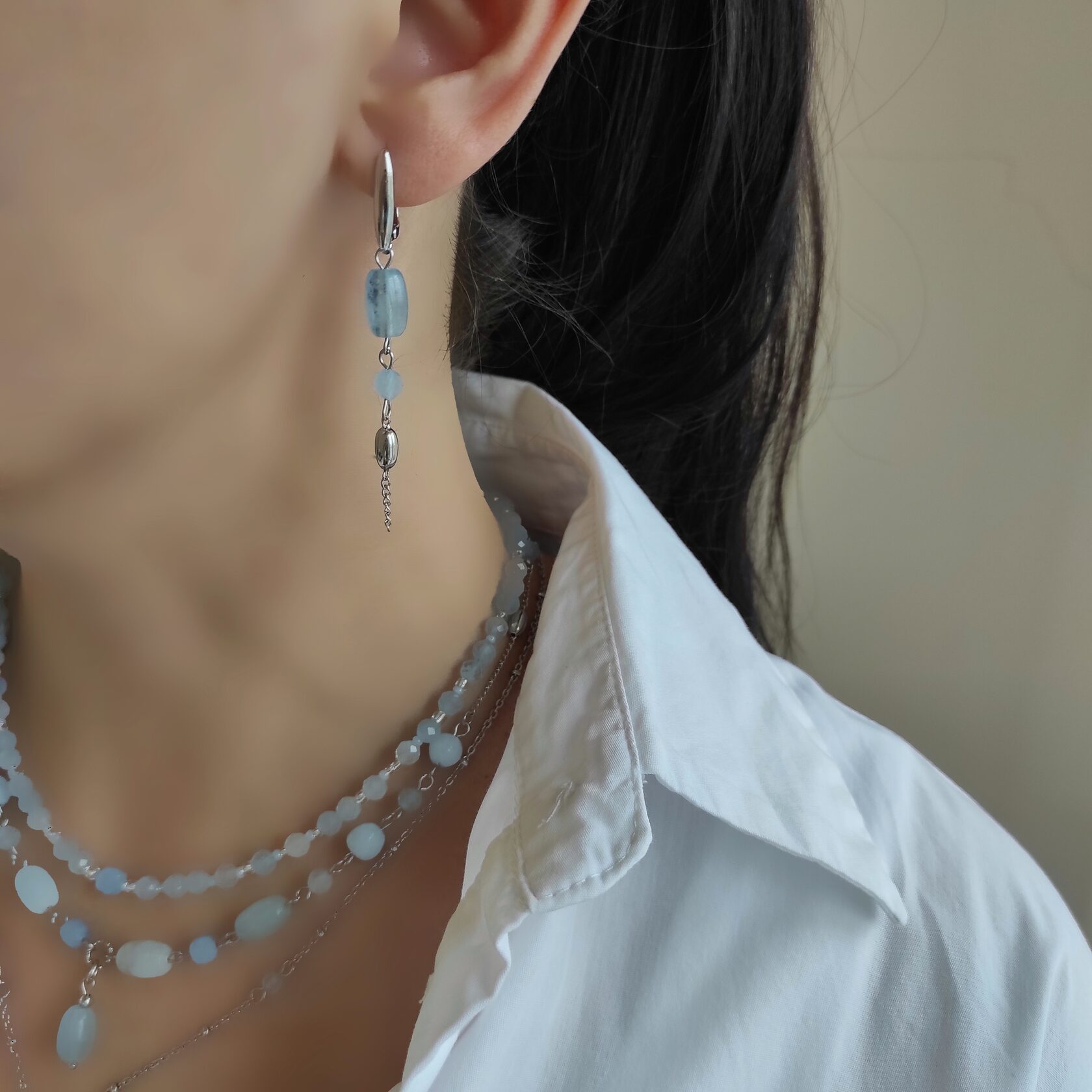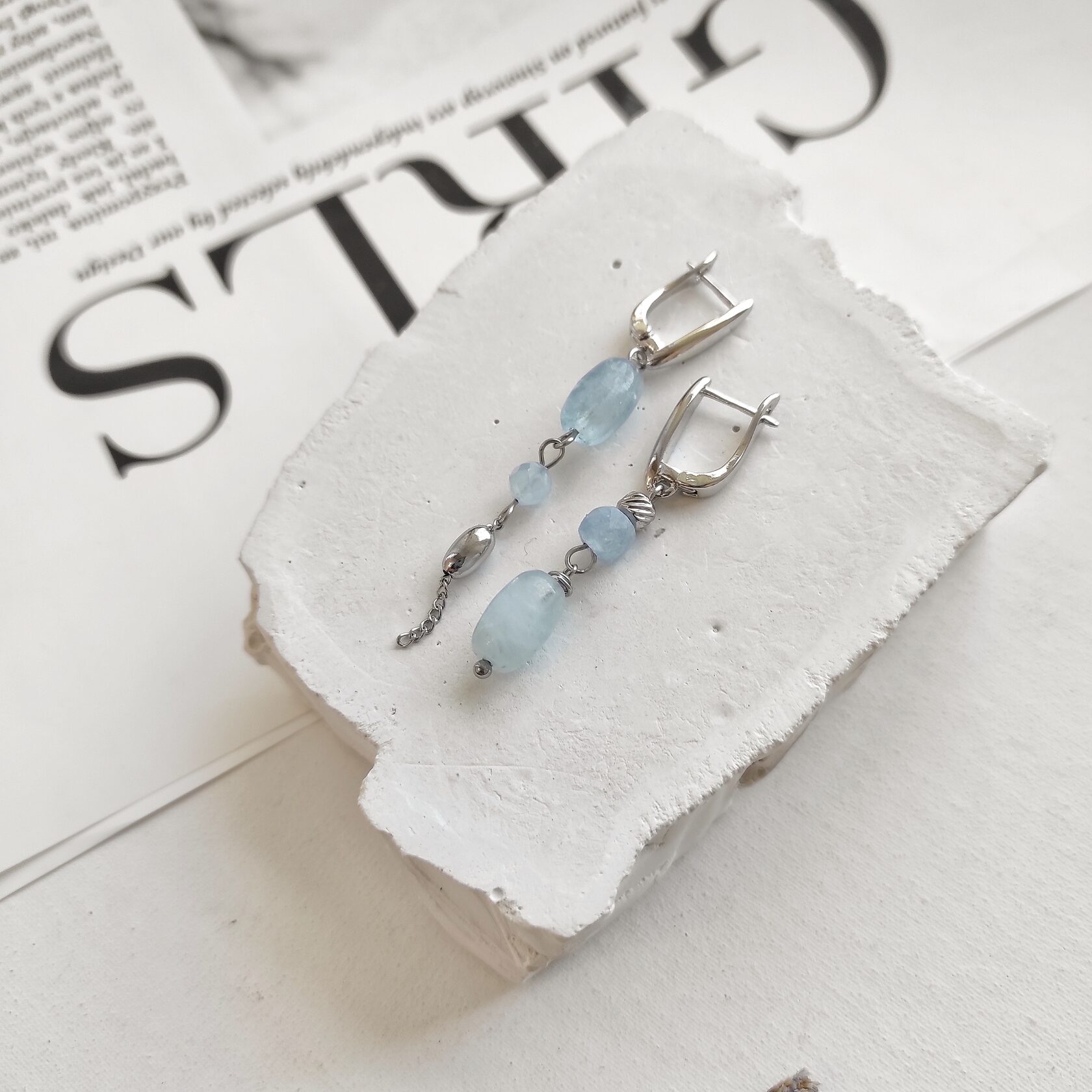 Серьги - асимметричная пара из натурального аквамарина.