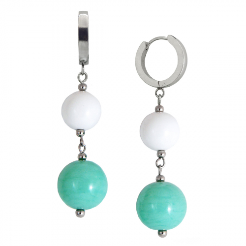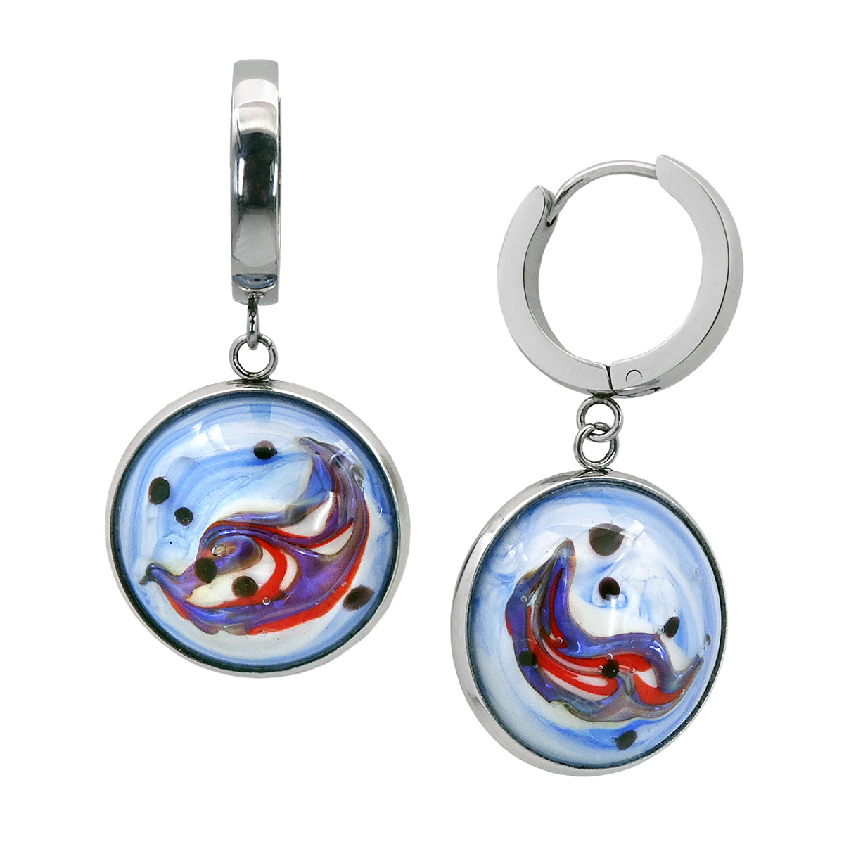Серьги изготовлены из муранского стекла и гипоаллергенной ювелирной стали, что очень важно для людей с чувствительной кожей. Металл не темнеет и не подвергается воздействиям окружающей среды, надолго обеспечивая красивый внешний вид изделия. Длина серег - 7см. Диаметр стеклянного элемента - 2 см. Вес обеих серег - 10 гр.
