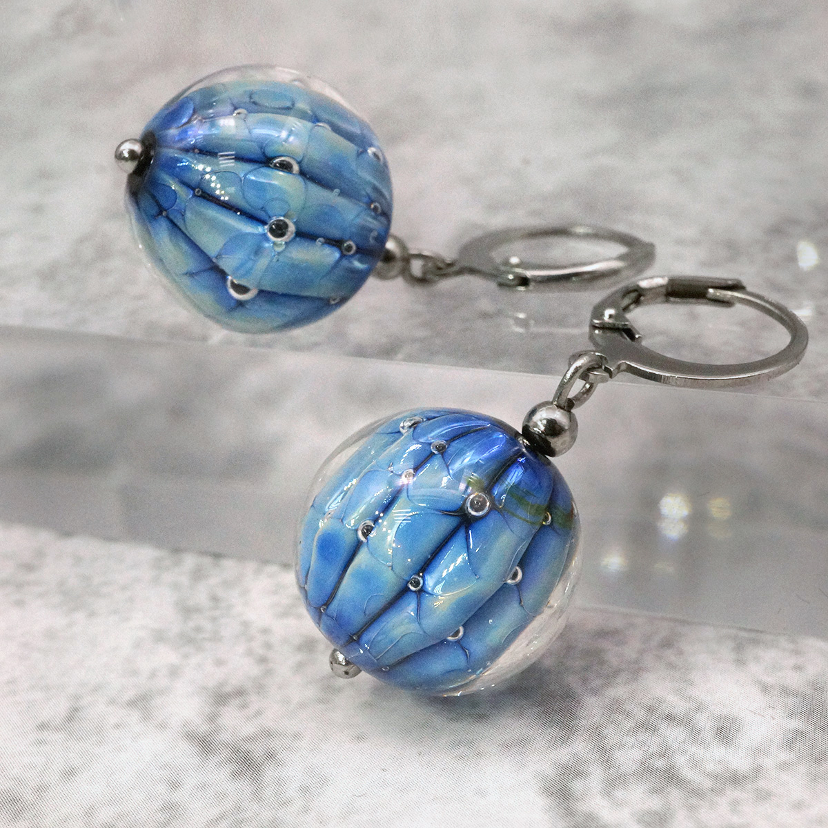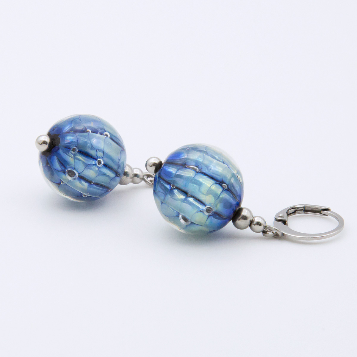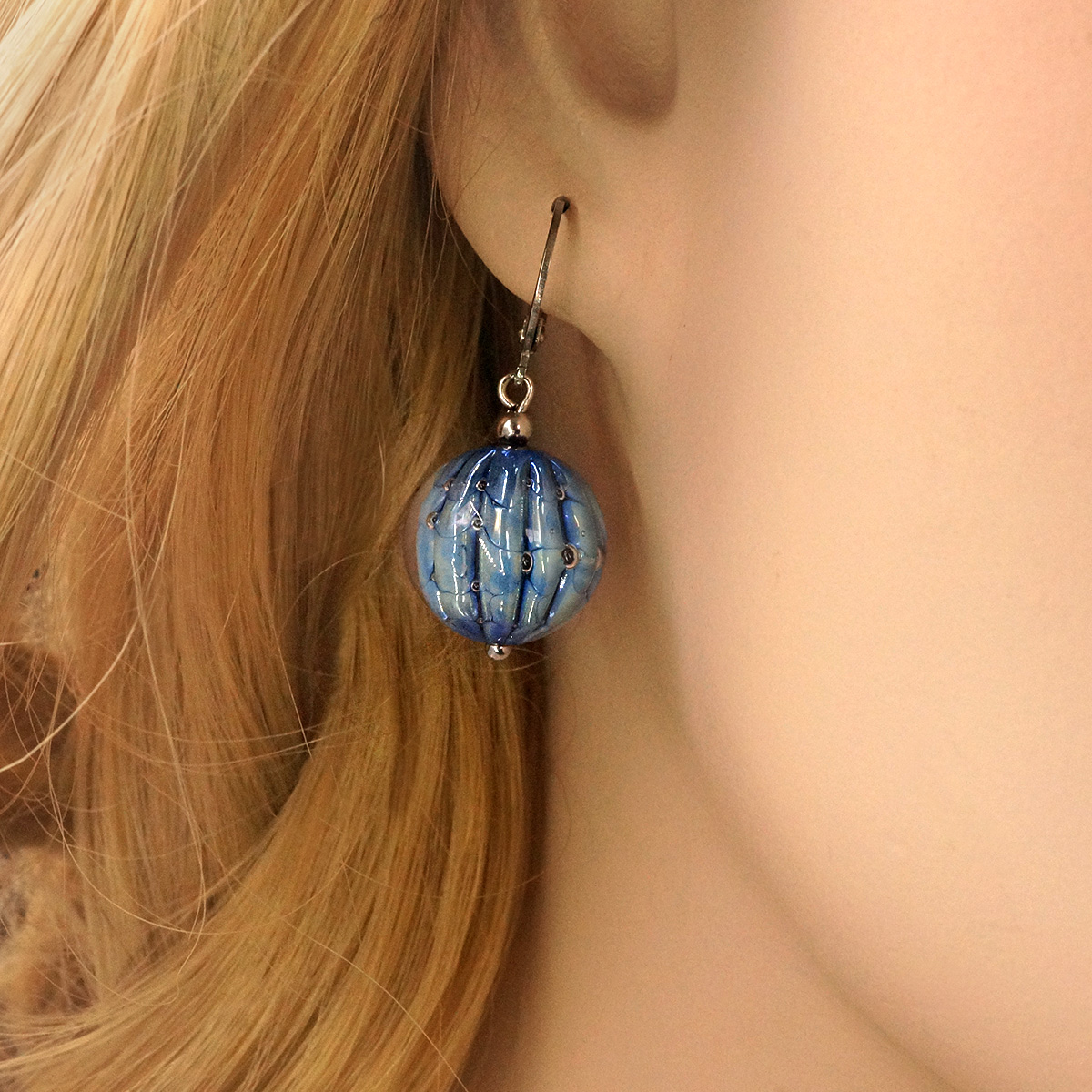 Серьги изготовлены из муранского стекла и гипоаллергенной ювелирной стали, что очень важно для людей с чувствительной кожей. Металл не темнеет и не подвергается воздействиям окружающей среды, надолго обеспечивая красивый внешний вид изделия.  Длина серег - 3,5 см. Диаметр стеклянного шарика - 1,5 см. Вес обеих серег - 11 гр.