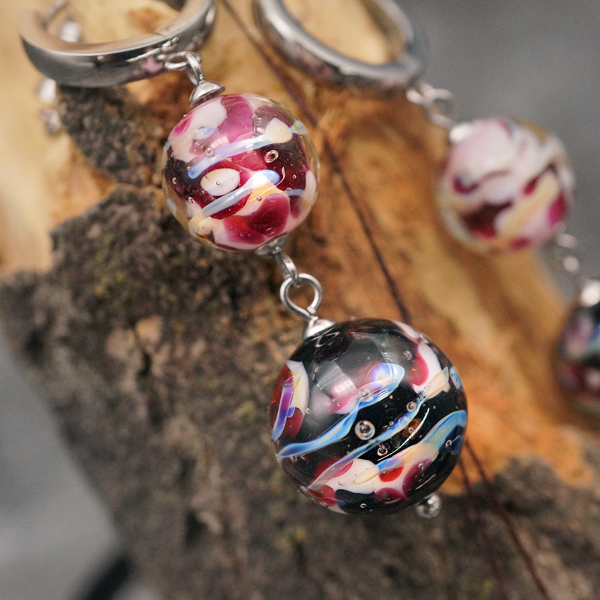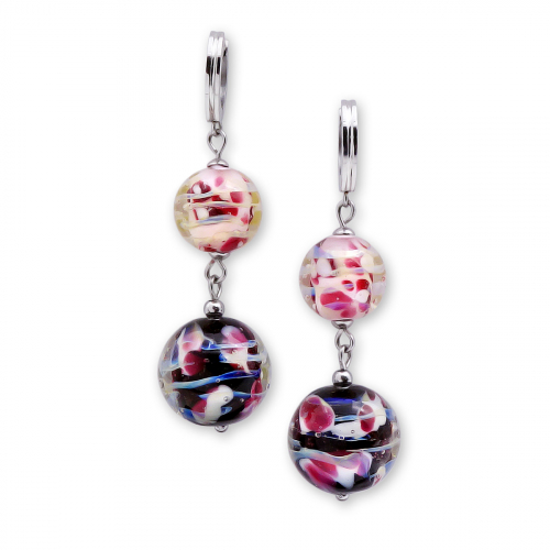 Серьги изготовлены из муранского стекла и гипоаллергенной ювелирной стали, что очень важно для людей с чувствительной кожей. Металл не темнеет и не подвергается воздействиям окружающей среды, надолго обеспечивая красивый внешний вид изделия. Длина серег - 6 см. Диаметр стеклянных шариков - 1,2 и 1,5 см.  Вес обеих серег - 17 гр.