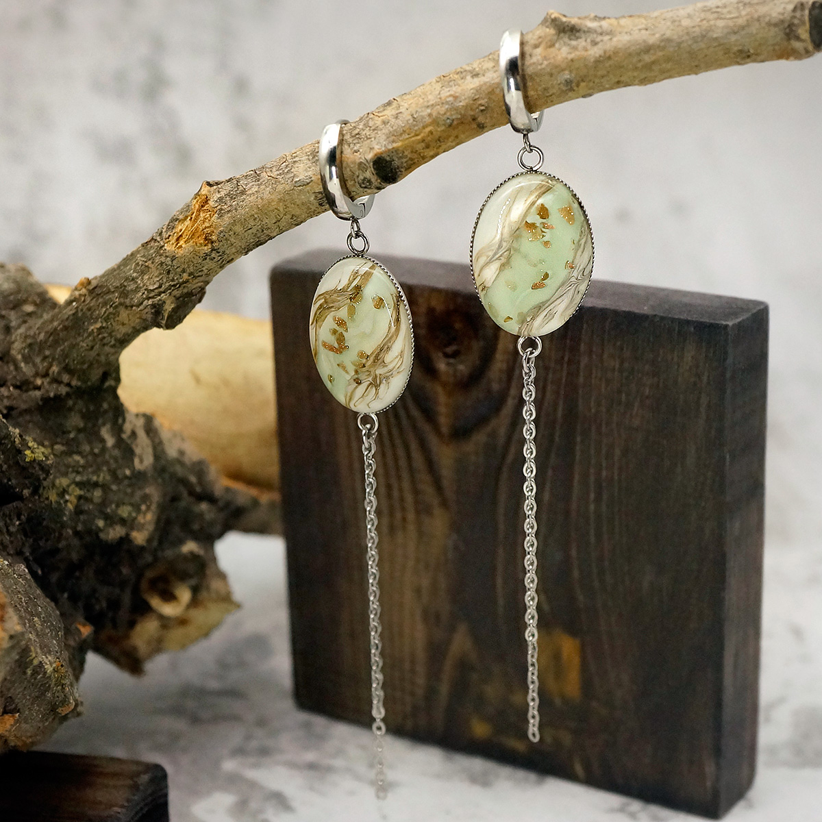Серьги изготовлены из муранского стекла и гипоаллергенной ювелирной стали, что очень важно для людей с чувствительной кожей. Металл не темнеет и не подвергается воздействиям окружающей среды, надолго обеспечивая красивый внешний вид изделия. Длина серег - 9 см. Размер стеклянного элемента - 1,9х2,6 см.  Вес обеих серег - 11 гр.