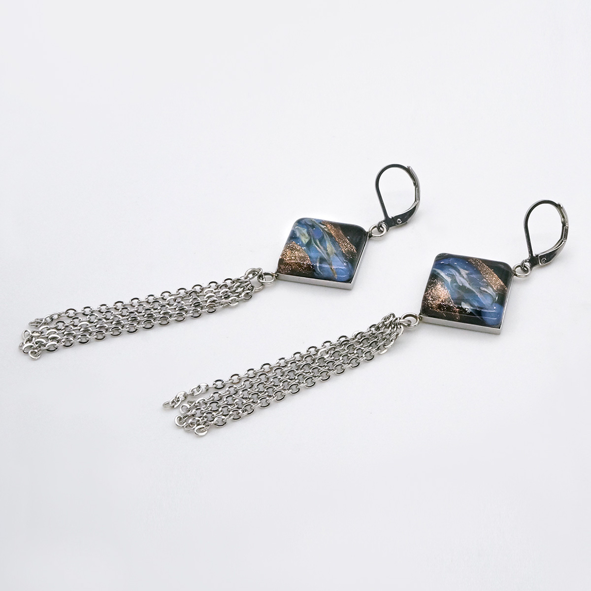 Серьги изготовлены из муранского стекла и гипоаллергенной ювелирной стали, что очень важно для людей с чувствительной кожей. Металл не темнеет и не подвергается воздействиям окружающей среды, надолго обеспечивая красивый внешний вид изделия.  Длина серег - 10,5 см. Размер стеклянного элемента - 2,2*2,2 см. Вес обеих серег - 10.