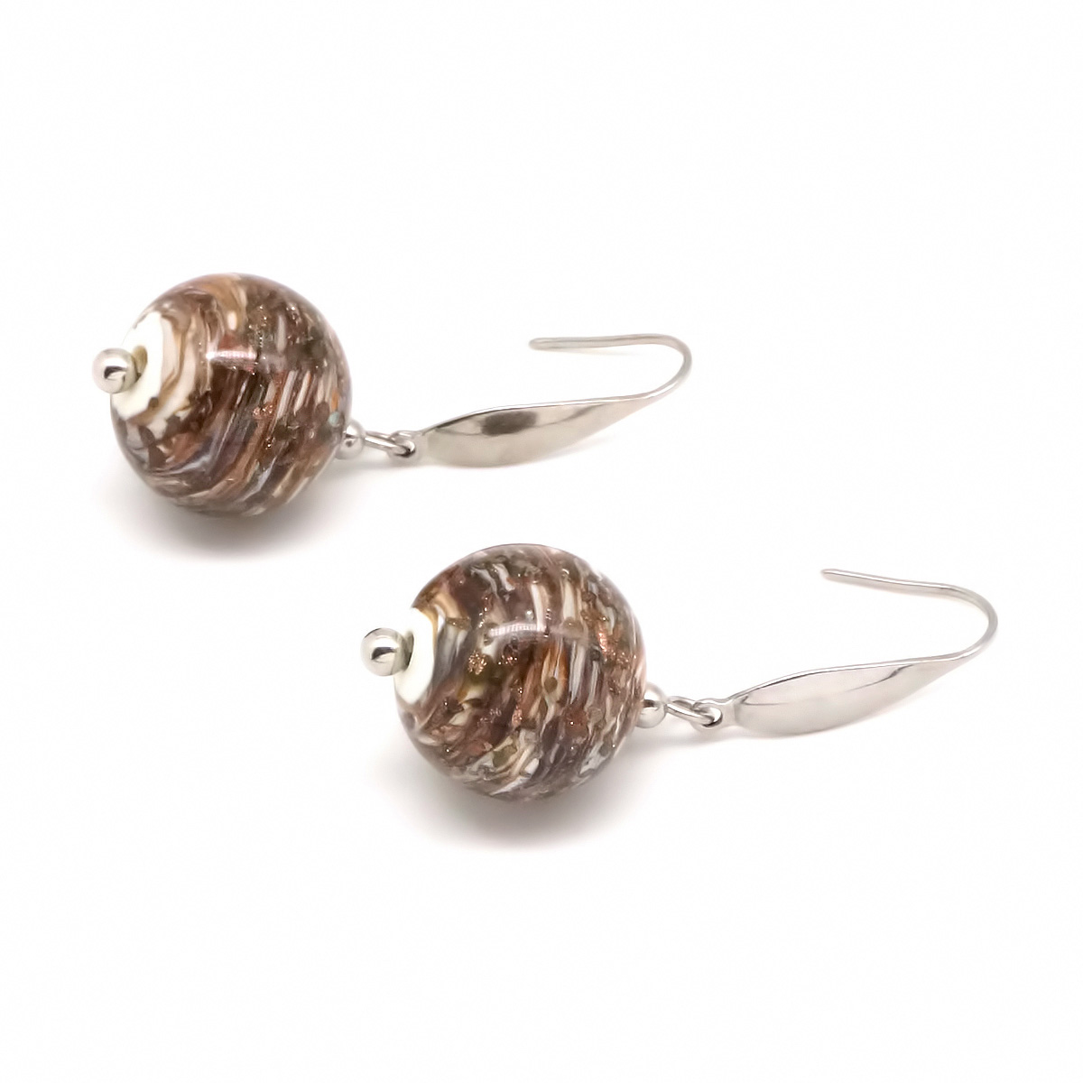 Серьги изготовлены из муранского стекла и гипоаллергенной ювелирной стали, что очень важно для людей с чувствительной кожей. Металл не темнеет и не подвергается воздействиям окружающей среды, надолго обеспечивая красивый внешний вид изделия. Длина серег - 3,5 см. Диаметр стеклянного шарика - 1,5 см. Вес обеих серег - 11 гр.