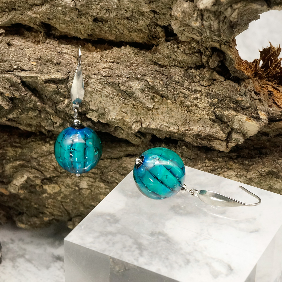 Серьги изготовлены из муранского стекла и гипоаллергенной ювелирной стали, что очень важно для людей с чувствительной кожей. Металл не темнеет и не подвергается воздействиям окружающей среды, надолго обеспечивая красивый внешний вид изделия. Длина серег - 4 см. Диаметр стеклянного шарика - 1,5 см.  Вес обеих серег - 11 гр.