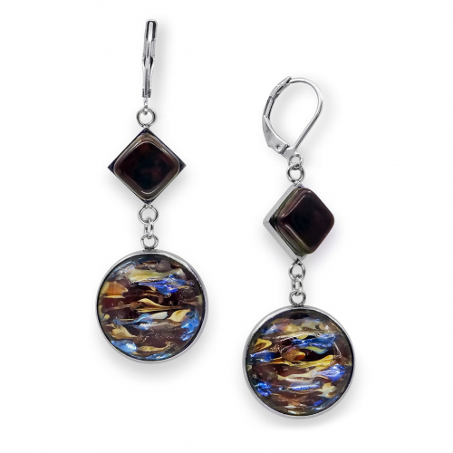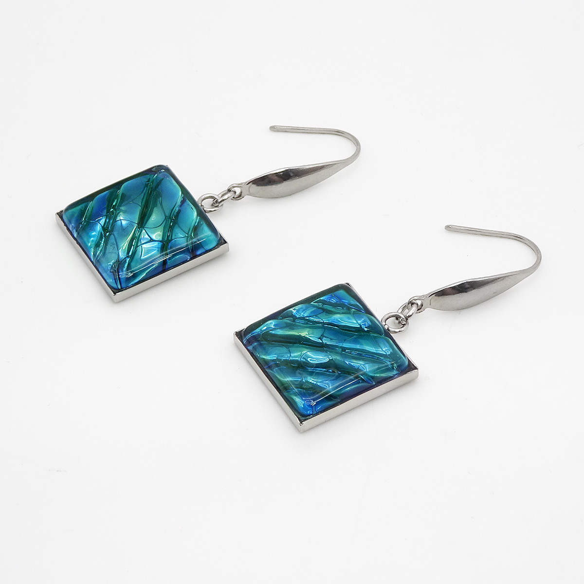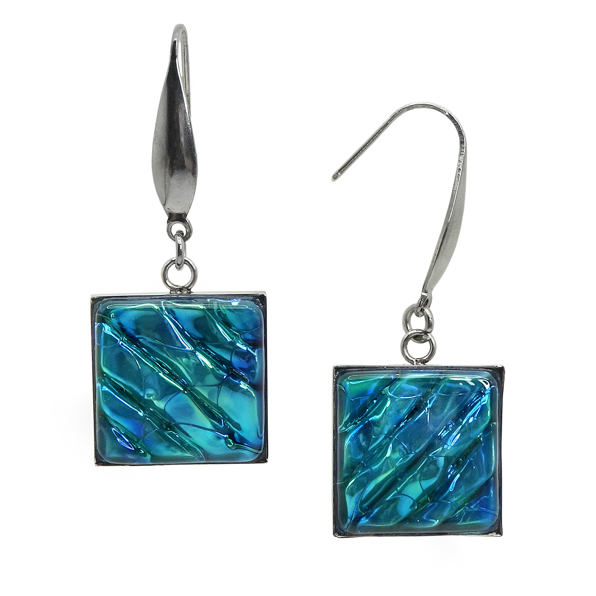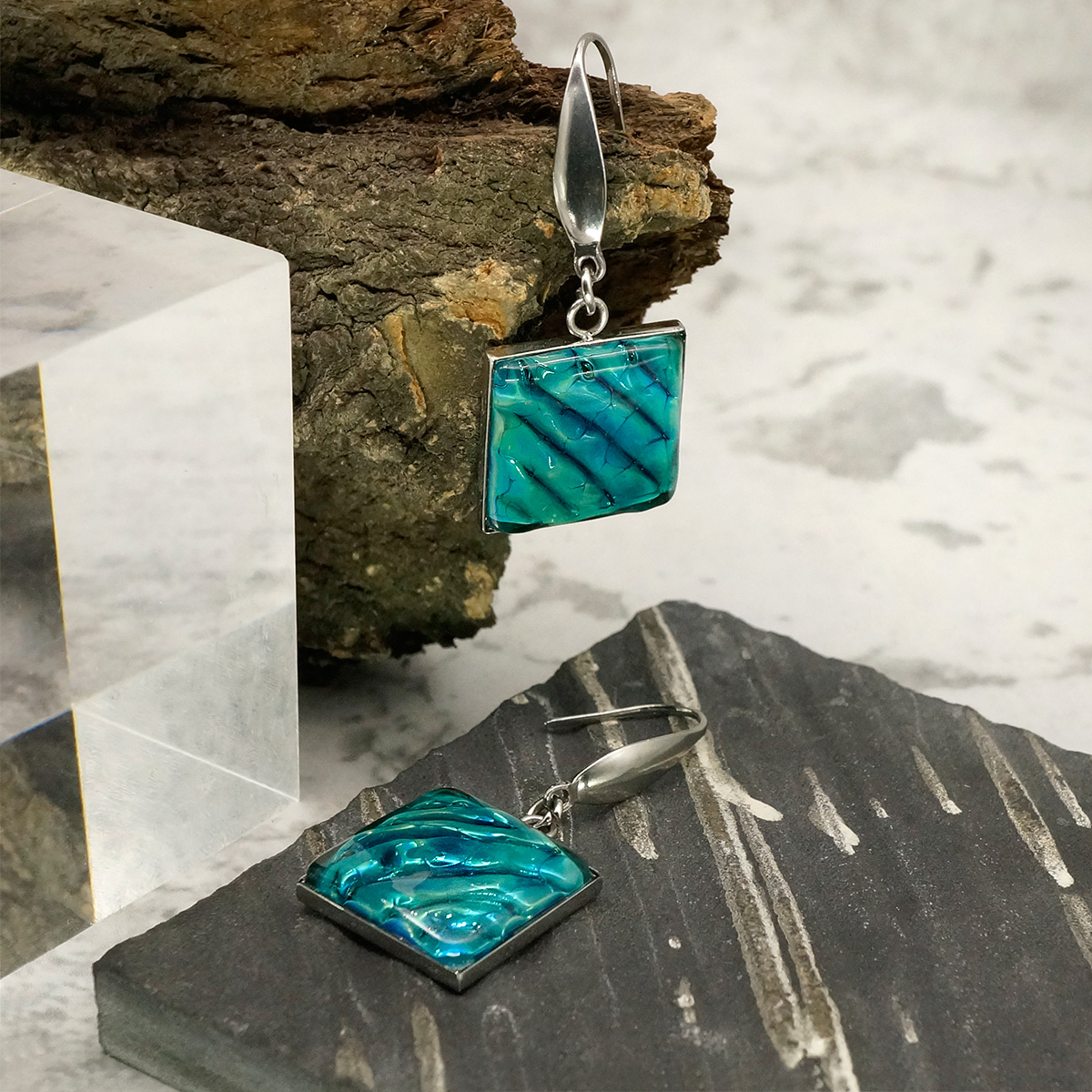 Серьги изготовлены из муранского стекла и гипоаллергенной ювелирной стали, что очень важно для людей с чувствительной кожей. Металл не темнеет и не подвергается воздействиям окружающей среды, надолго обеспечивая красивый внешний вид изделия. Длина серег - 4 см. Размер  стеклянного элемента 1,6х1,6 см.  Вес обеих серег - 7 гр.