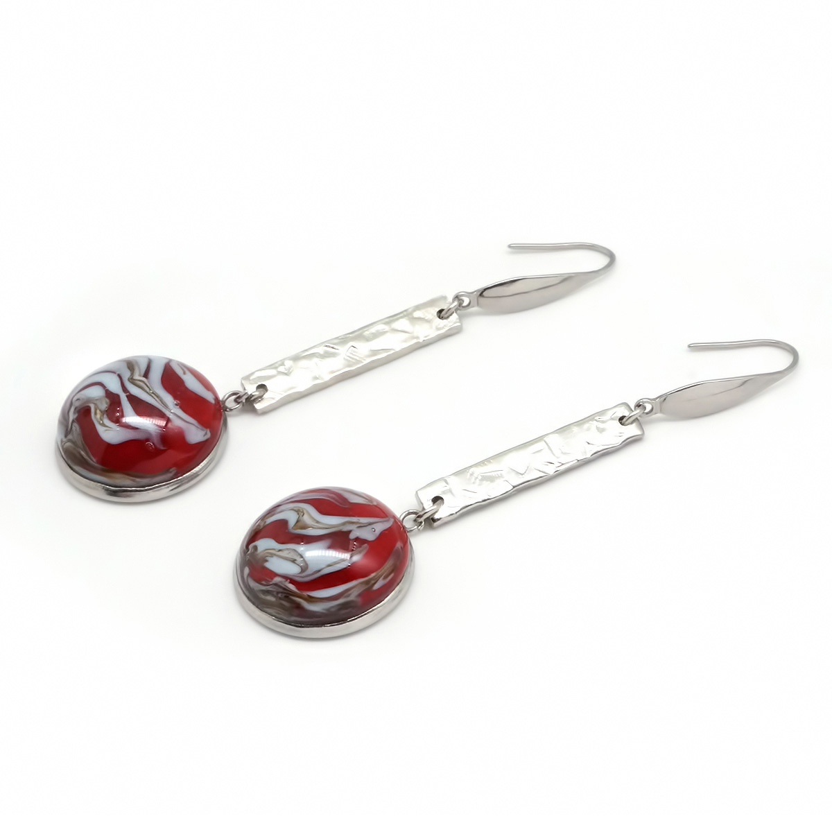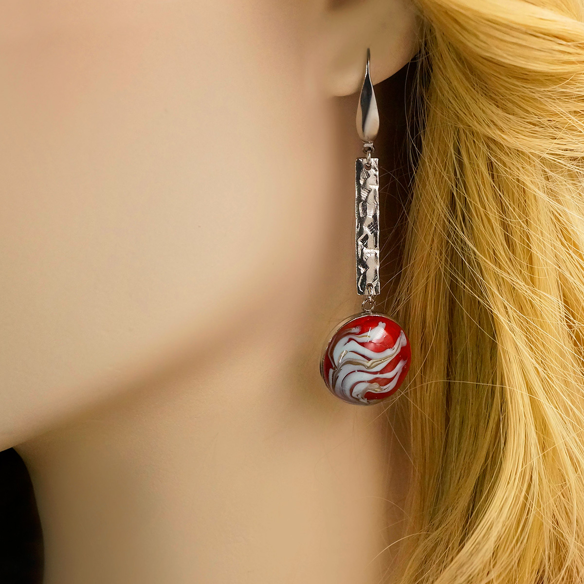 Серьги изготовлены из муранского стекла и гипоаллергенной ювелирной стали, что очень важно для людей с чувствительной кожей. Металл не темнеет и не подвергается воздействиям окружающей среды, надолго обеспечивая красивый внешний вид изделия. Длина серег - 7 см. Диаметр стеклянного элемента - 2 см. Вес - 12 гр.