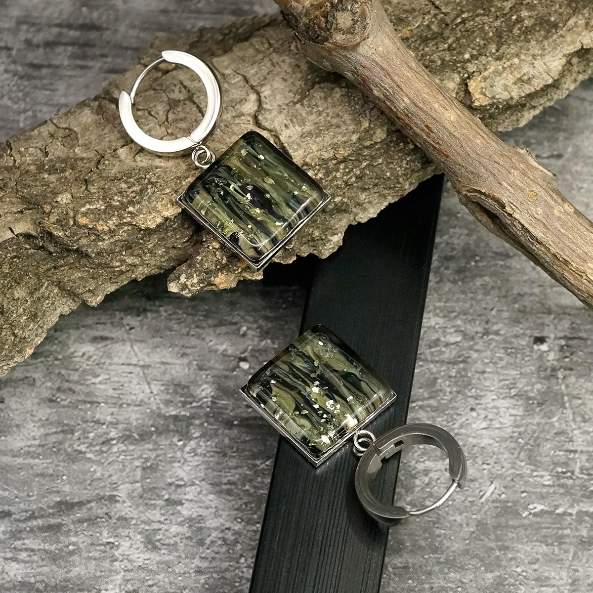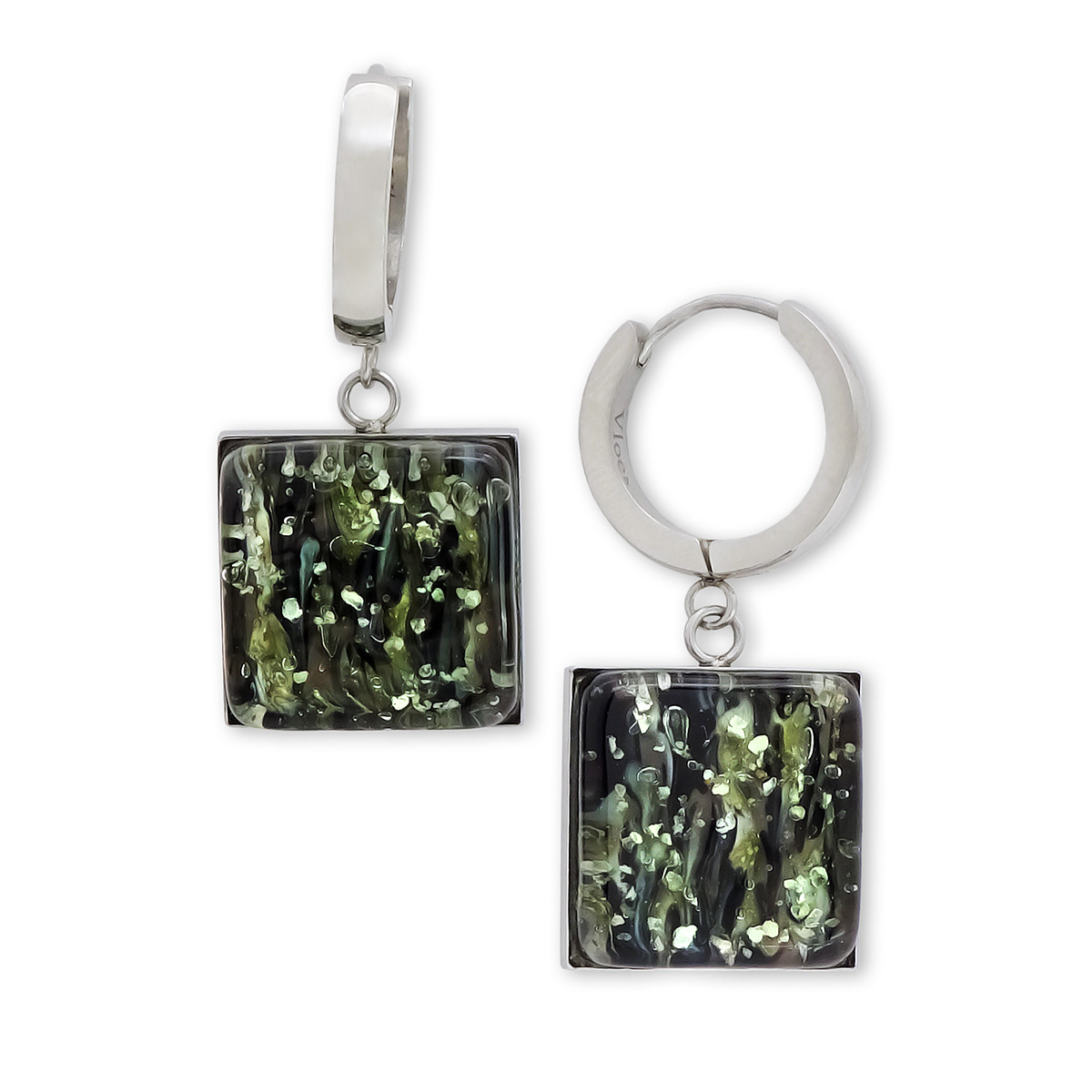 Серьги изготовлены из муранского стекла и гипоаллергенной ювелирной стали, что очень важно для людей с чувствительной кожей. Металл не темнеет и не подвергается воздействиям окружающей среды, надолго обеспечивая красивый внешний вид изделия. Длина серег - 3,5 см. Размер  стеклянного элемента 1,6х1,6 см. Вес - 11 гр.