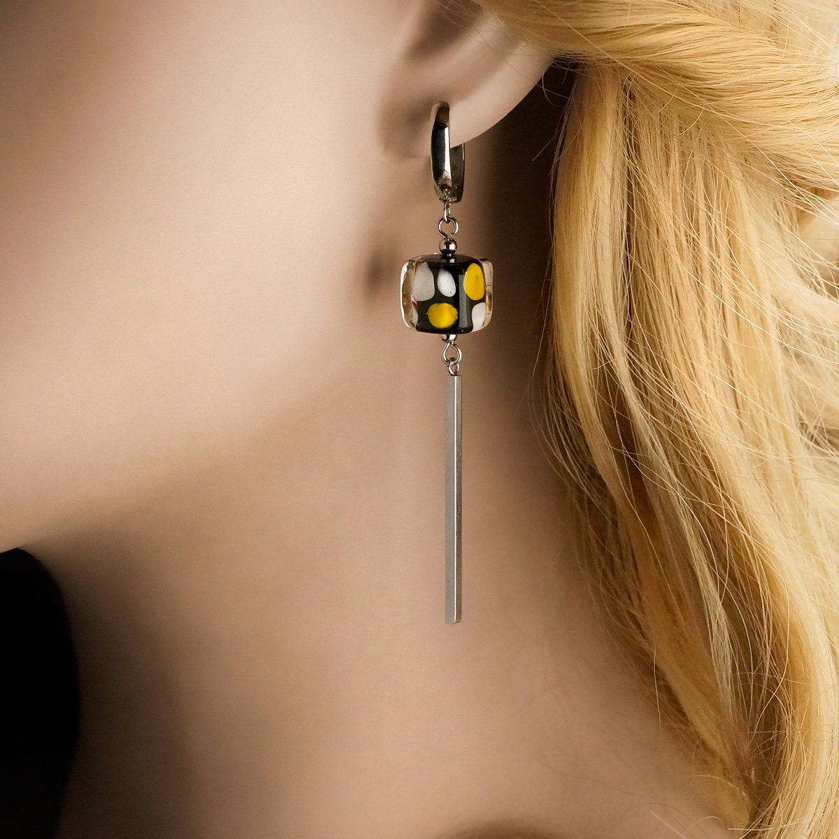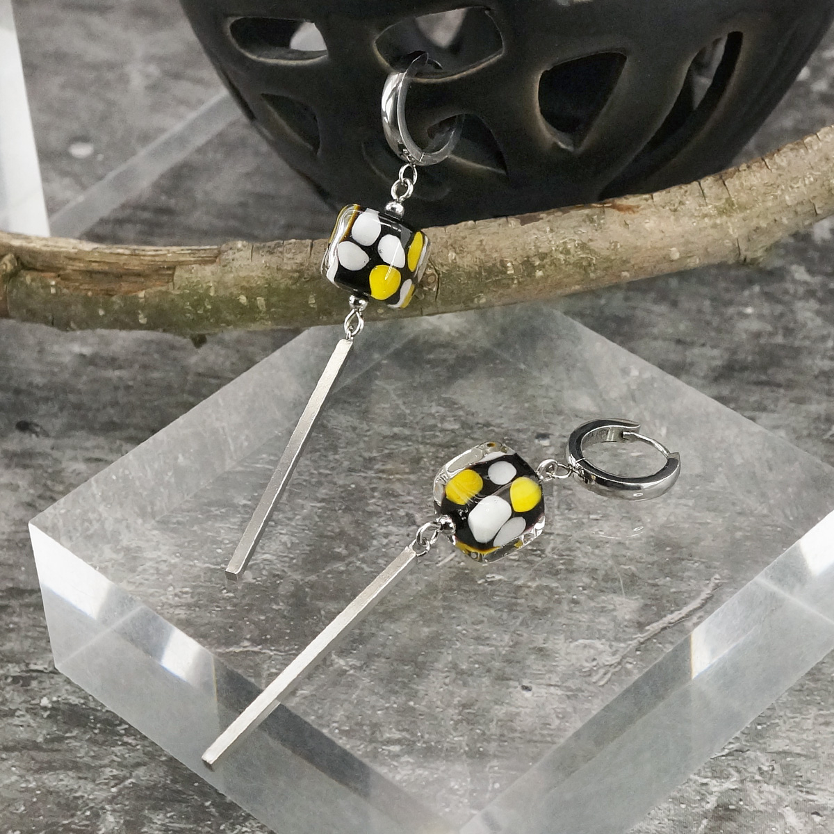 Серьги изготовлены из муранского стекла и гипоаллергенной ювелирной стали, что очень важно для людей с чувствительной кожей. Металл не темнеет и не подвергается воздействиям окружающей среды, надолго обеспечивая красивый внешний вид изделия. Длина серег - 7 см. Диаметр стеклянных кубов - 1.  Вес обеих серег - 20 гр.