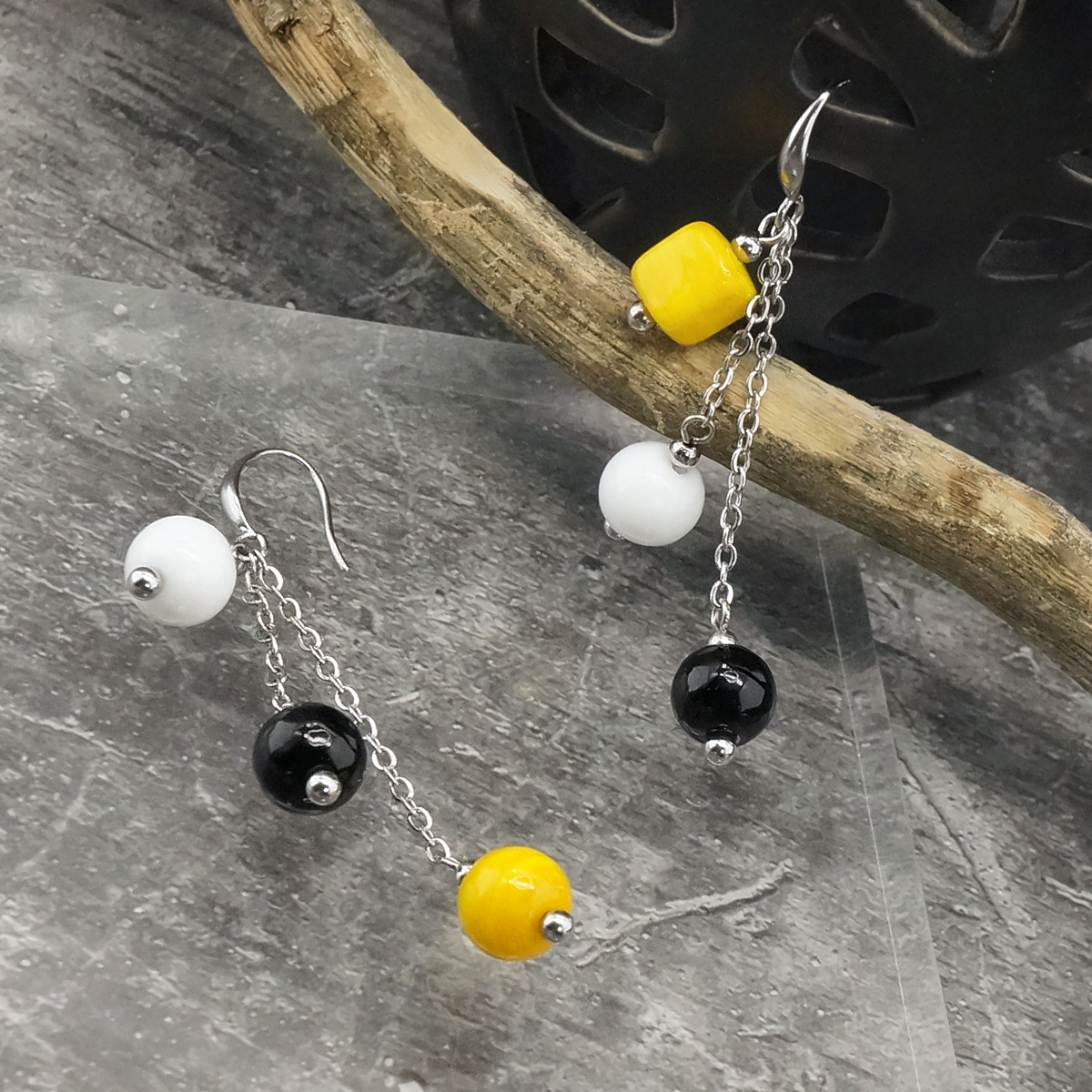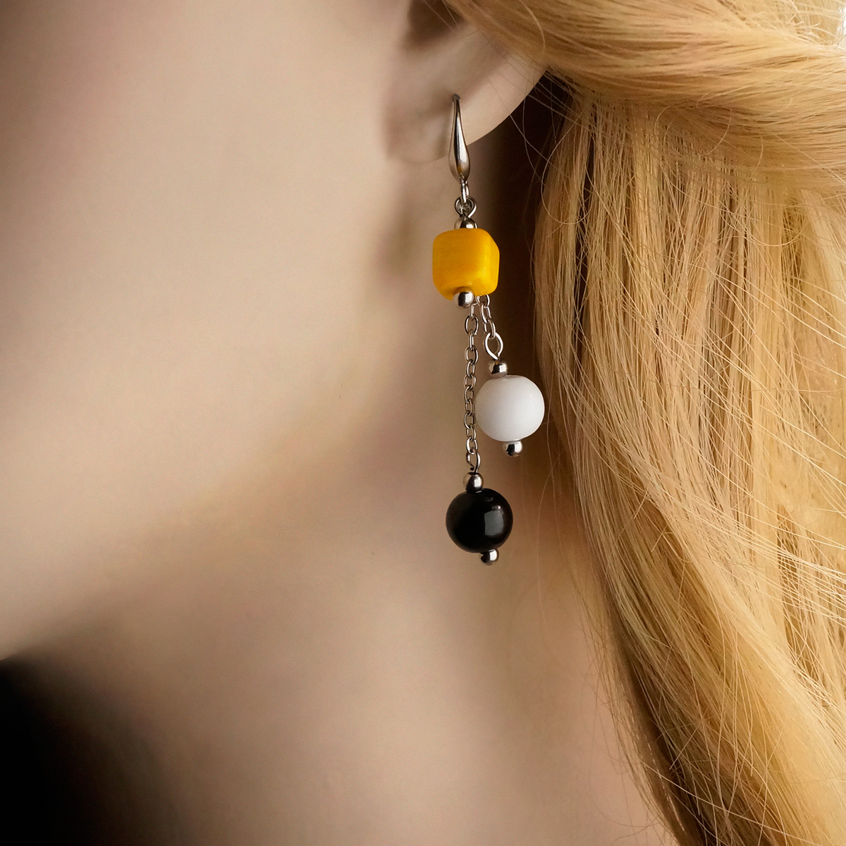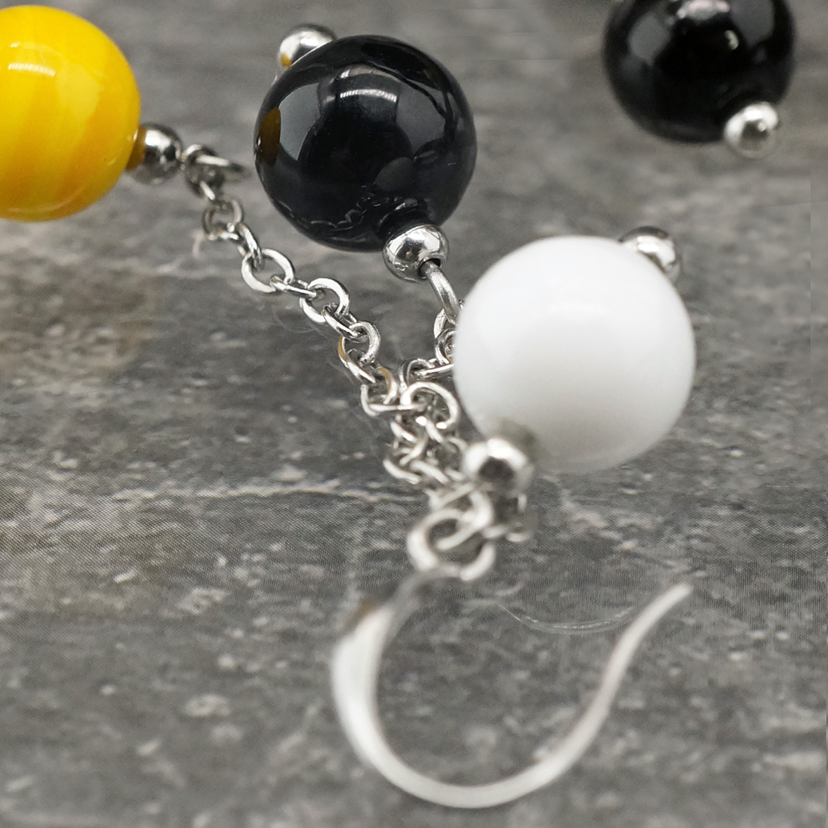 Серьги изготовлены из муранского стекла и гипоаллергенной ювелирной стали, что очень важно для людей с чувствительной кожей. Металл не темнеет и не подвергается воздействиям окружающей среды, надолго обеспечивая красивый внешний вид изделия. Длина серег - 6 см. Диаметр стеклянных элементов - 1 и 0,7 см.  Вес обеих серег - 20 гр.