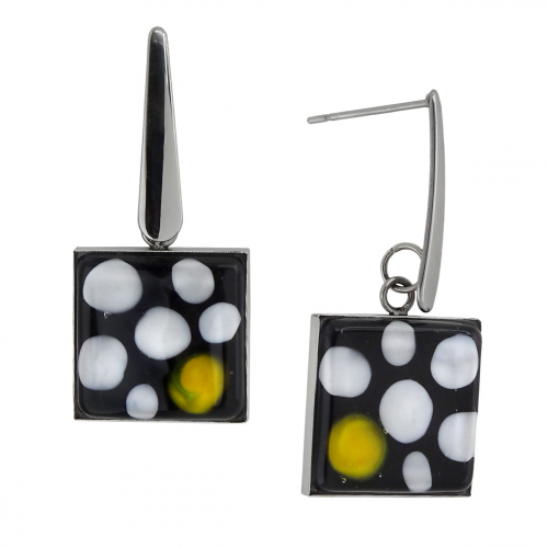 Серьги изготовлены из муранского стекла и гипоаллергенной ювелирной стали, что очень важно для людей с чувствительной кожей. Металл не темнеет и не подвергается воздействиям окружающей среды, надолго обеспечивая красивый внешний вид изделия. Размер стеклянного элемента - 1,6*1,6 см. Длина серег - 3,5 см. Вес обеих серег - 7 гр.