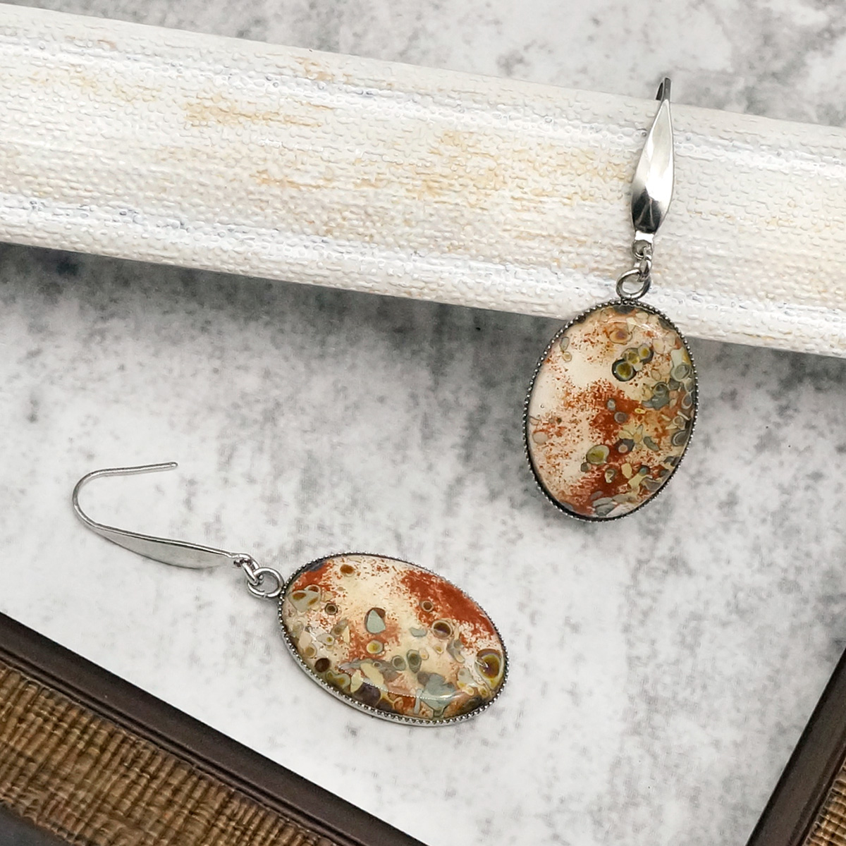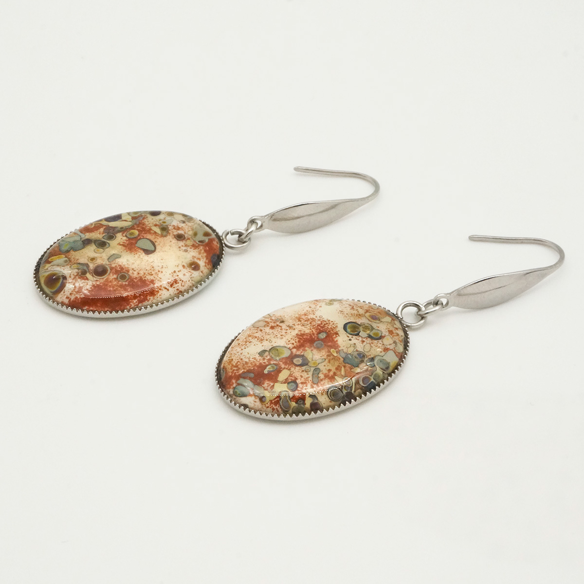 Серьги изготовлены из муранского стекла и гипоаллергенной ювелирной стали, что очень важно для людей с чувствительной кожей. Металл не темнеет и не подвергается воздействиям окружающей среды, надолго обеспечивая красивый внешний вид изделия. Длина серег - 5 см. Размер стеклянного элемента - 1,9x2,6 см.  Вес обеих серег - 10 гр.