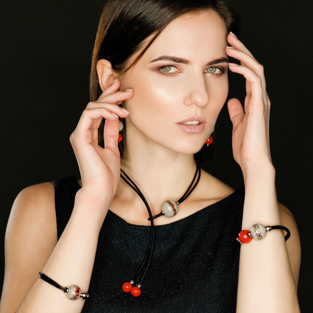 Focus - яркая жизнеутверждающая коллекция бижутерии из муранского стекла. Акцентом коллекции являются стеклянные элементы сферической формы. Преобладающая цветовая гамма - красная и светло-серая. В отдельных изделиях она дополнена вкраплениями оттенков золота и темного шоколада, что образует узор, имитирующий инкрустацию мелкими самоцветами.