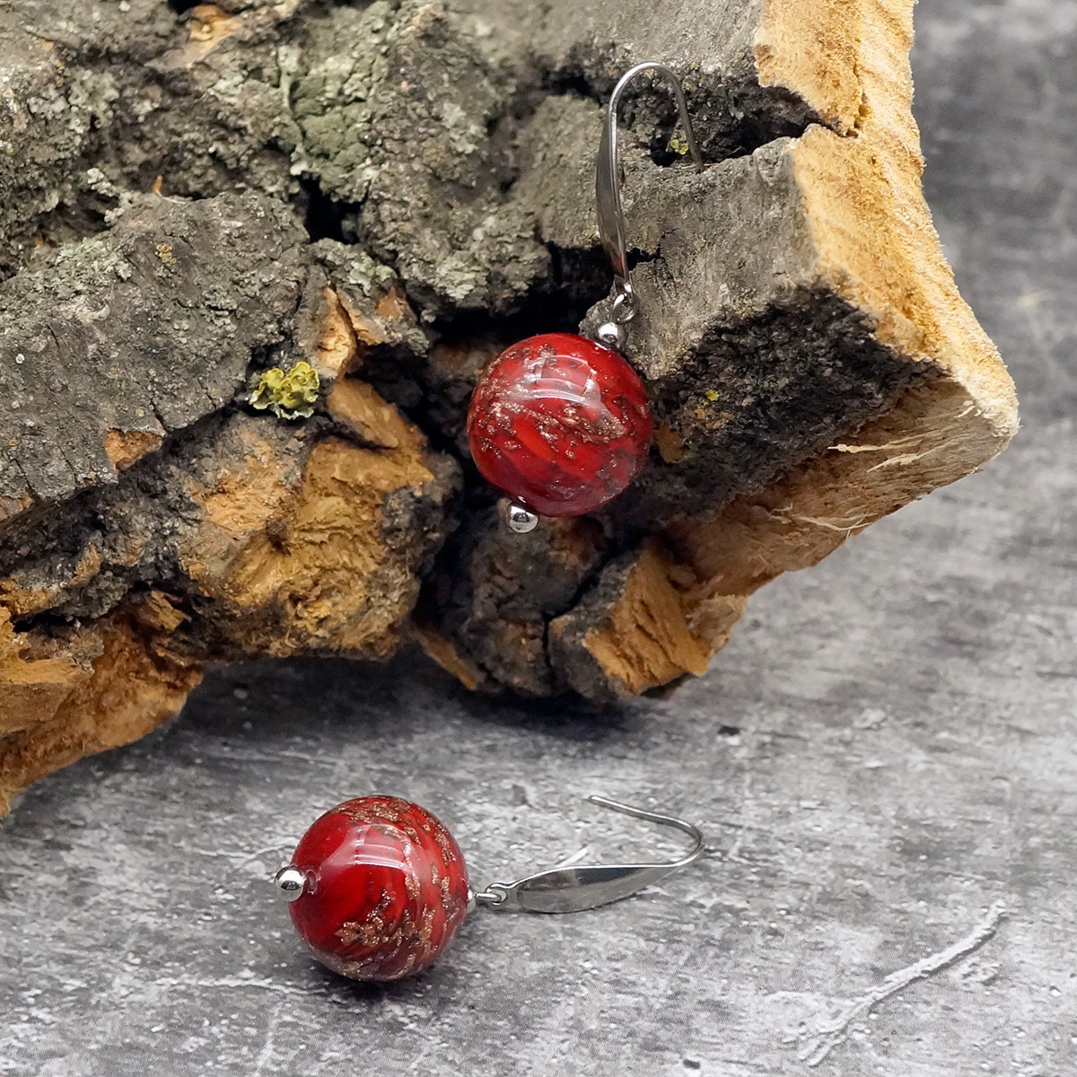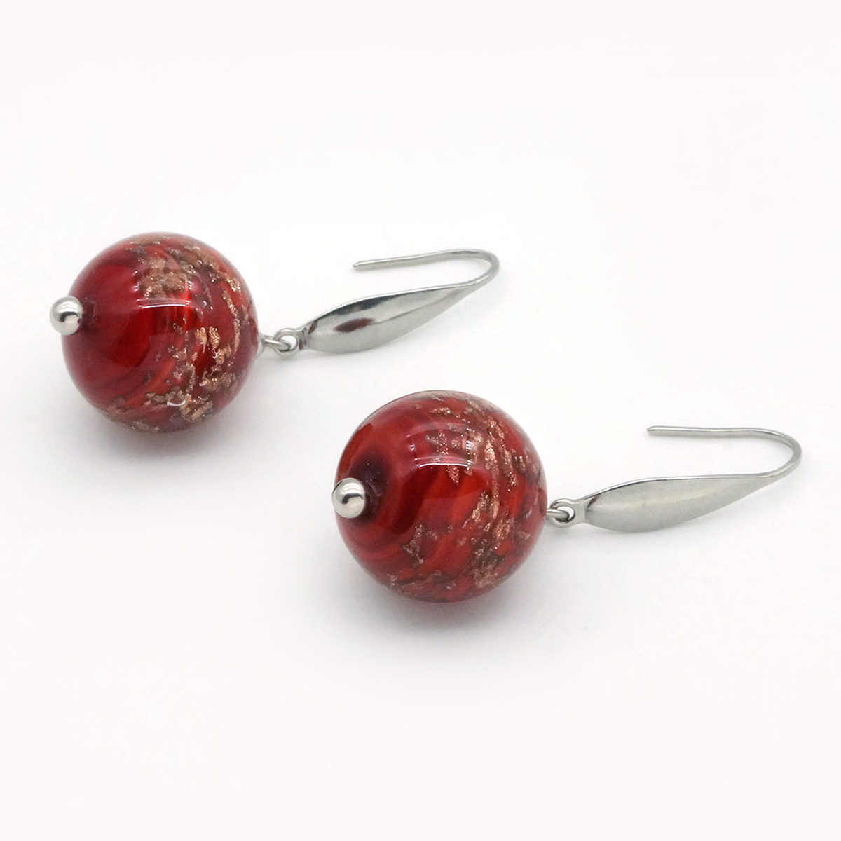 Серьги изготовлены из муранского стекла и гипоаллергенной ювелирной стали, что очень важно для людей с чувствительной кожей. Металл не темнеет и не подвергается воздействиям окружающей среды, надолго обеспечивая красивый внешний вид изделия. Длина серег - 4 см. Диаметр стеклянного шарика - 1,5 см.  Вес обеих серег - 11 гр.