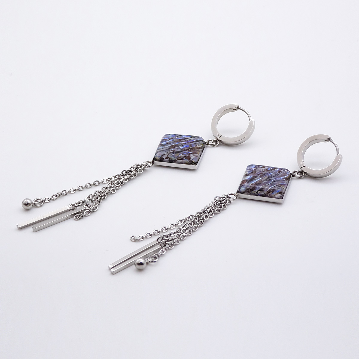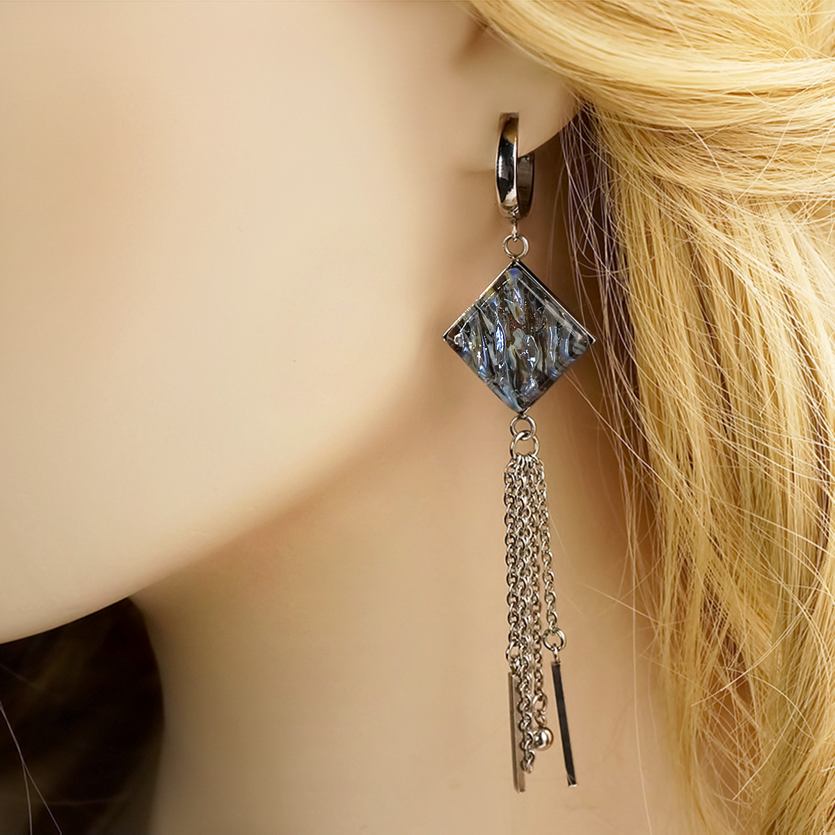 Серьги изготовлены из муранского стекла и гипоаллергенной ювелирной стали, что очень важно для людей с чувствительной кожей. Металл не темнеет и не подвергается воздействиям окружающей среды, надолго обеспечивая красивый внешний вид изделия. Длина серег - 10 см. Размер стеклянного элемента - 2,3*2,3 см. Вес - 15 гр.
