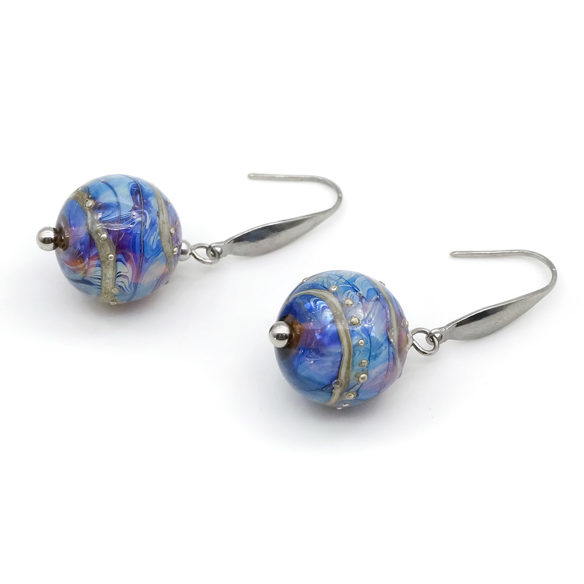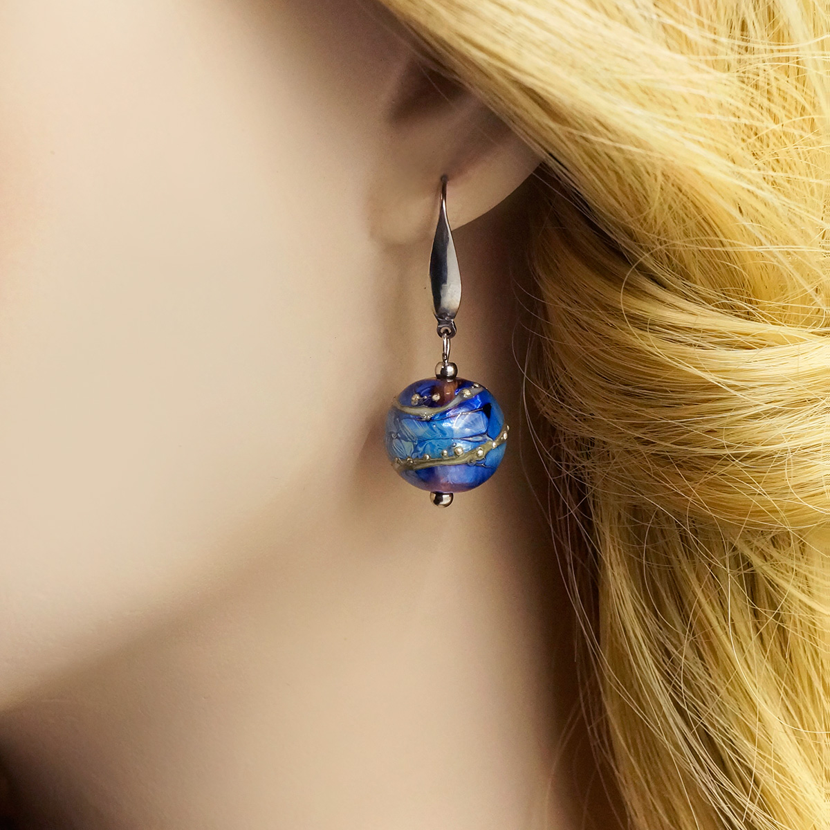 Серьги изготовлены из муранского стекла и гипоаллергенной ювелирной стали, что очень важно для людей с чувствительной кожей. Металл не темнеет и не подвергается воздействиям окружающей среды, надолго обеспечивая красивый внешний вид изделия. Длина серег - 4 см. Диаметр стеклянного шарика - 1,5 см.  Вес обеих серег - 11 гр.