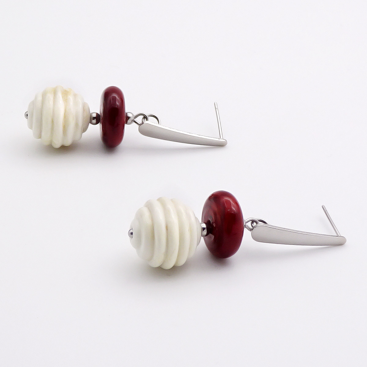 Серьги изготовлены из муранского стекла и гипоаллергенной ювелирной стали, что очень важно для людей с чувствительной кожей. Металл не темнеет и не подвергается воздействиям окружающей среды, надолго обеспечивая красивый внешний вид изделия. Длина серег - 4,5 см. Диаметр стеклянного шарика - 1,2 см. Рондель 0,6х1,3 см.  Вес обеих серег - 11 гр.