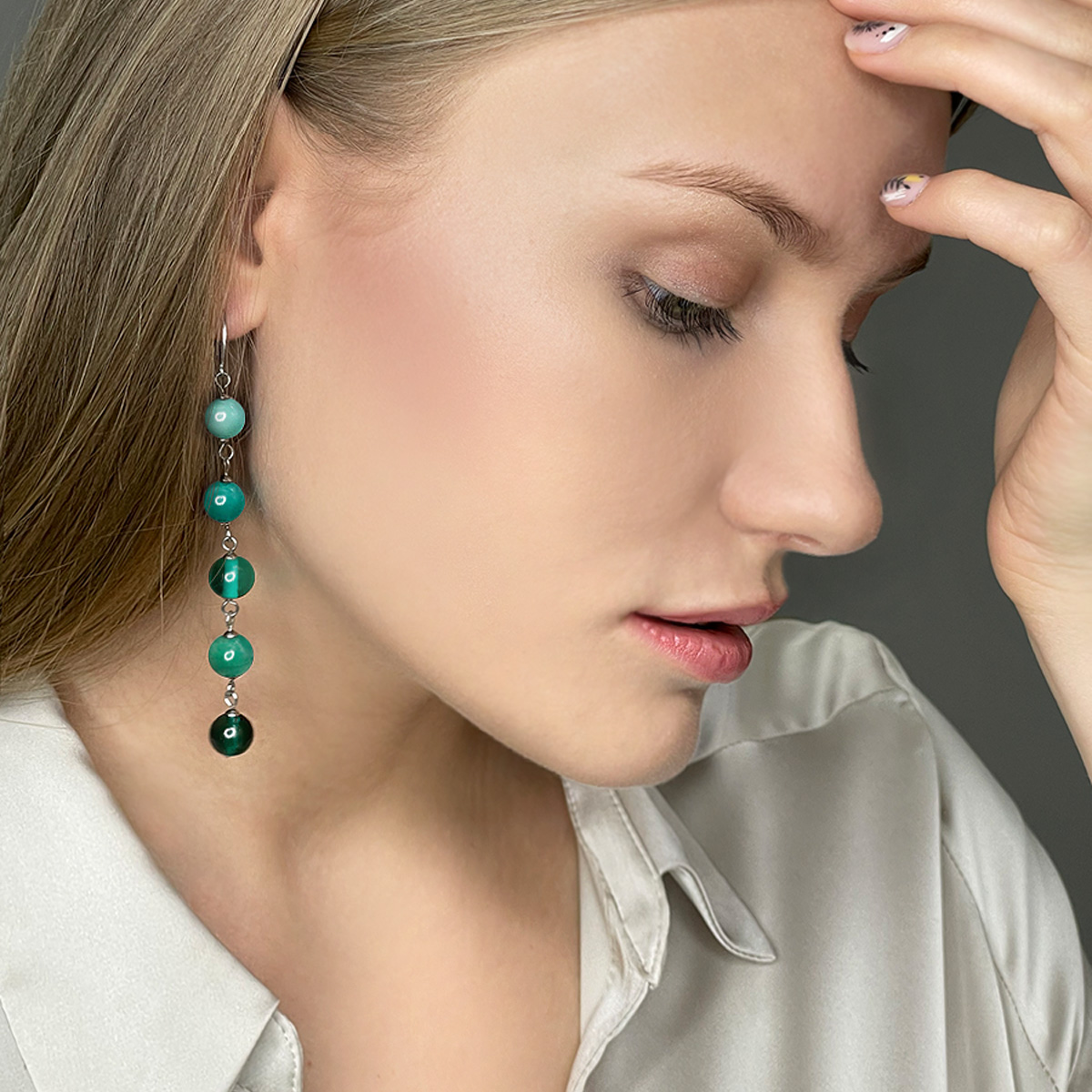 Серьги изготовлены из муранского стекла и гипоаллергенной ювелирной стали, что очень важно для людей с чувствительной кожей. Металл не темнеет и не подвергается воздействиям окружающей среды, надолго обеспечивая красивый внешний вид изделия. Диаметр стеклянных бусин - 0,8 см. Длина серег - 10 см. Вес обеих серег - 14 гр.