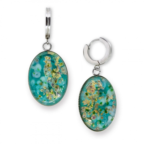 Серьги изготовлены из муранского стекла и гипоаллергенной ювелирной стали, что очень важно для людей с чувствительной кожей. Металл не темнеет и не подвергается воздействиям окружающей среды, надолго обеспечивая красивый внешний вид изделия. Длина серег - 3,5 см. Диаметр стеклянного элемента - 2 см.  Вес обеих серег - 8 гр.