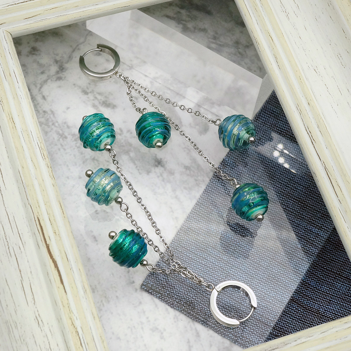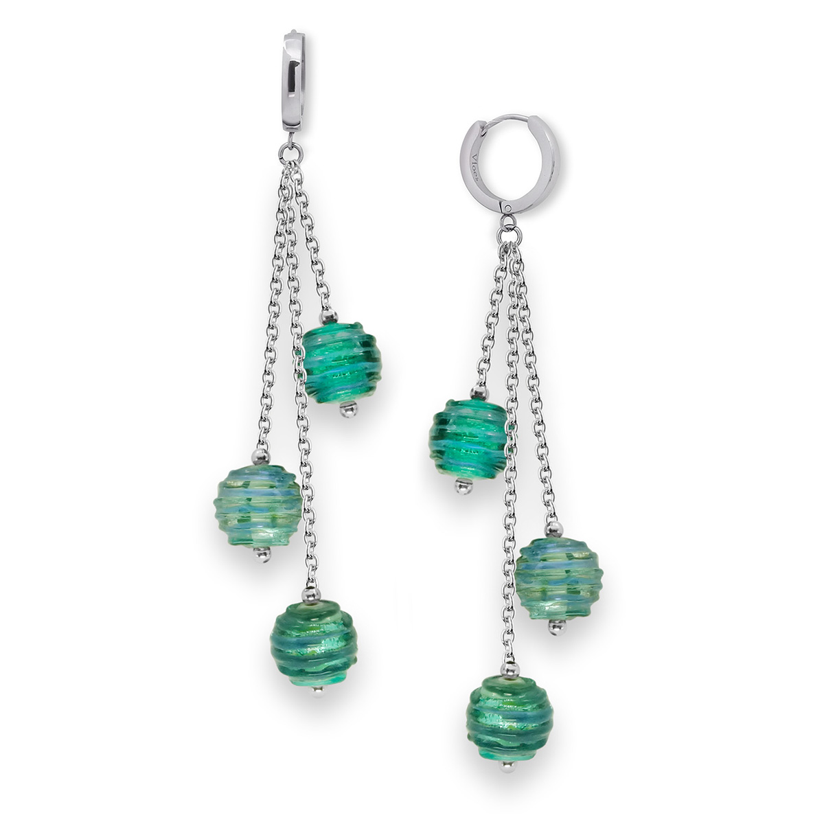Серьги изготовлены из муранского стекла и гипоаллергенной ювелирной стали, что очень важно для людей с чувствительной кожей. Металл не темнеет и не подвергается воздействиям окружающей среды, надолго обеспечивая красивый внешний вид изделия. Длина серег - 7 см. Диаметр стеклянного шарика - 1 см.  Вес обеих серег - 11 гр.