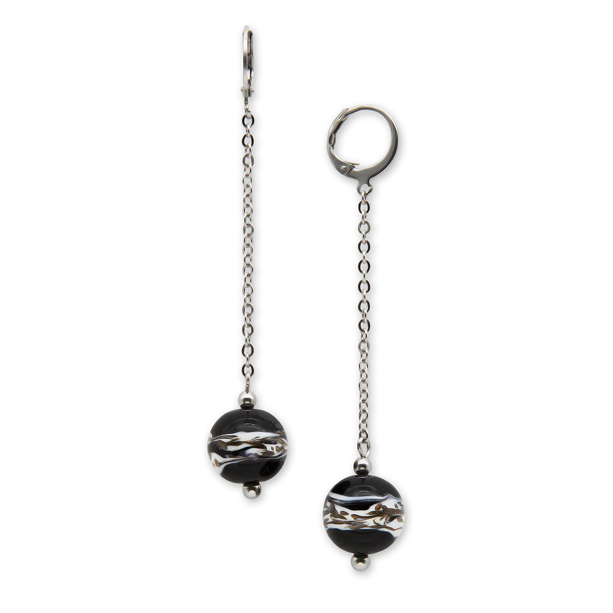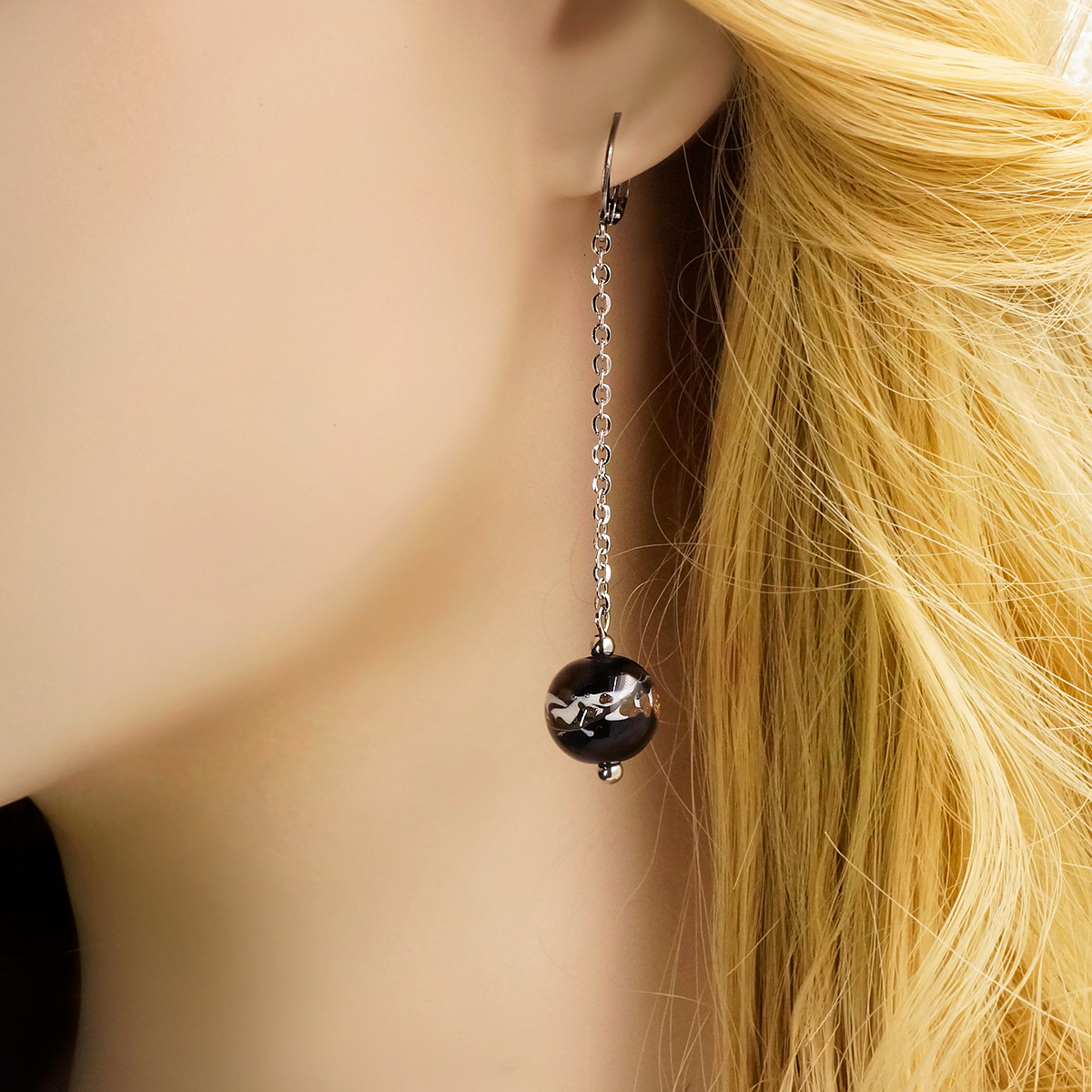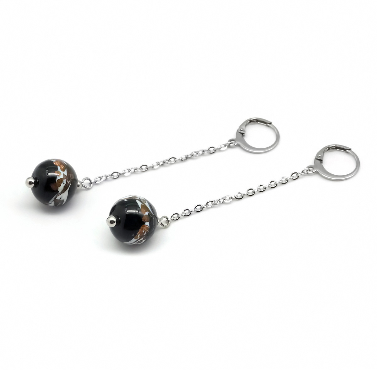 Серьги изготовлены из муранского стекла и гипоаллергенной ювелирной стали, что очень важно для людей с чувствительной кожей. Металл не темнеет и не подвергается воздействиям окружающей среды, надолго обеспечивая красивый внешний вид изделия. Длина серег - 7 см. Диаметр стеклянного шарика - 1,2 см.  Вес обеих серег - 6,5 гр.