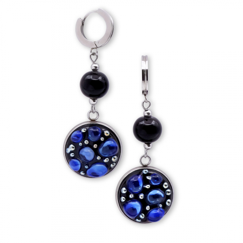 Серьги изготовлены из муранского стекла и гипоаллергенной ювелирной стали, что очень важно для людей с чувствительной кожей. Металл не темнеет и не подвергается воздействиям окружающей среды, надолго обеспечивая красивый внешний вид изделия. Длина серег - 7 см. Диаметр стеклянного шарика - 1,2 см.  Вес обеих серег - 6,5 гр.