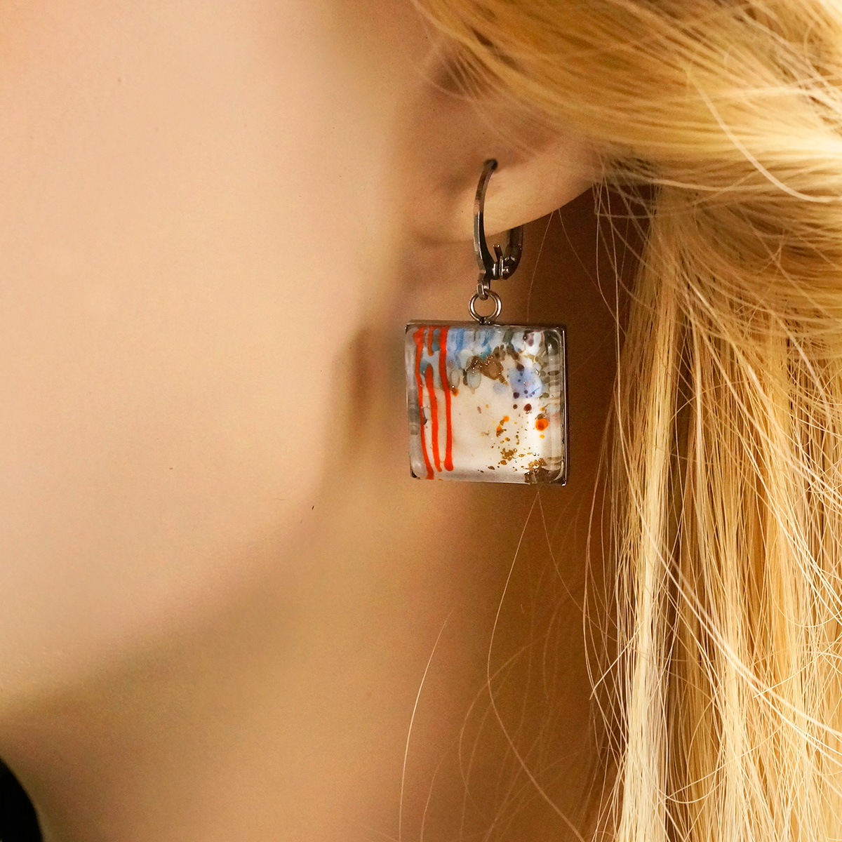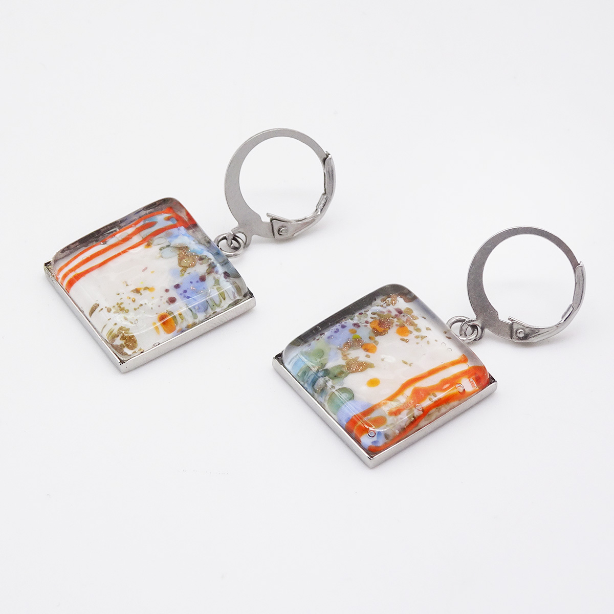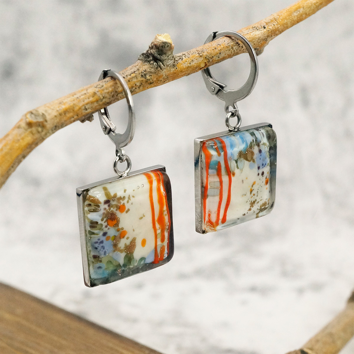 Серьги изготовлены из муранского стекла и гипоаллергенной ювелирной стали, что очень важно для людей с чувствительной кожей. Металл не темнеет и не подвергается воздействиям окружающей среды, надолго обеспечивая красивый внешний вид изделия. Длина серег - 3,5 см. Размер  стекл. элемента 1,6x1,6 см.  Вес обеих серег - 7 гр.