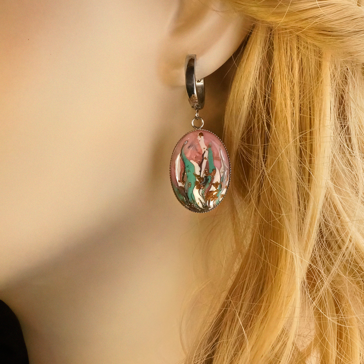 Серьги изготовлены из муранского стекла и гипоаллергенной ювелирной стали, что очень важно для людей с чувствительной кожей. Металл не темнеет и не подвергается воздействиям окружающей среды, надолго обеспечивая красивый внешний вид изделия. Длина серег - 5 см. Размер стеклянного элемента - 1,9x2,6 см.  Вес обеих серег - 10 гр.