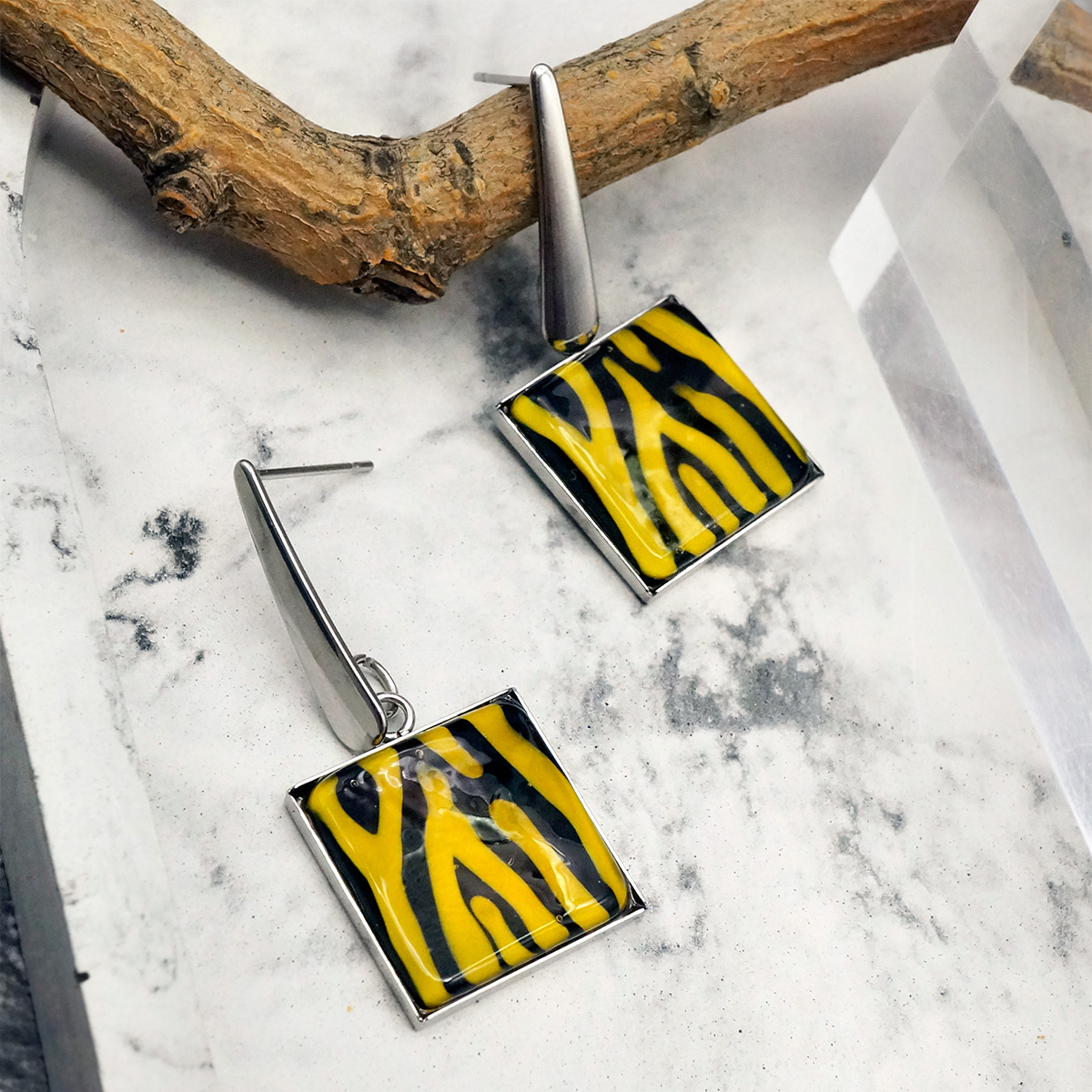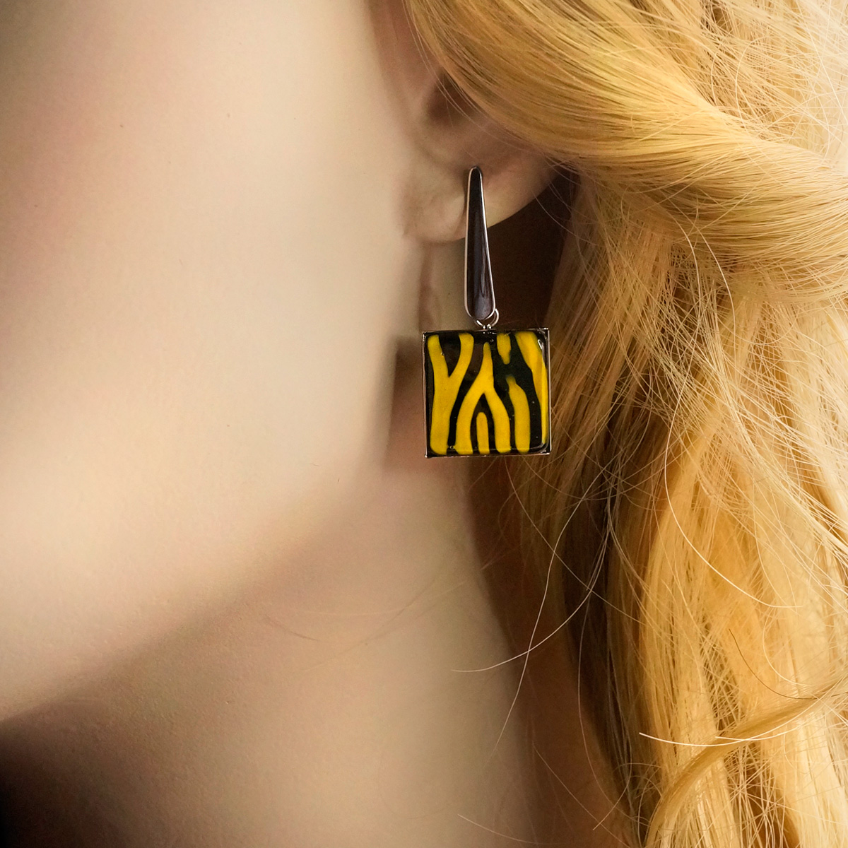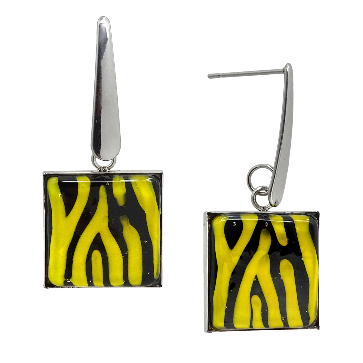 Серьги изготовлены из муранского стекла и гипоаллергенной ювелирной стали, что очень важно для людей с чувствительной кожей. Металл не темнеет и не подвергается воздействиям окружающей среды, надолго обеспечивая красивый внешний вид изделия. Размер стеклянного элемента - 1,6*1,6 см. Длина серег - 3,5 см. Вес обеих серег - 7 гр.