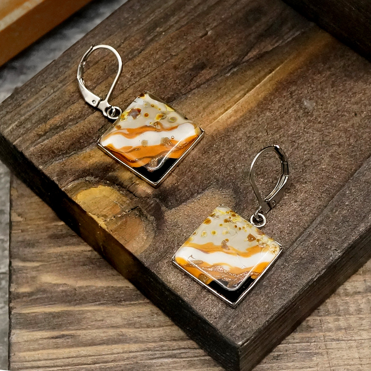 Серьги изготовлены из муранского стекла и гипоаллергенной ювелирной стали, что очень важно для людей с чувствительной кожей. Металл не темнеет и не подвергается воздействиям окружающей среды, надолго обеспечивая красивый внешний вид изделия. Длина серег - 3,5 см. Размер  стекл. элемента 1,6x1,6 см.  Вес обеих серег - 7 гр.