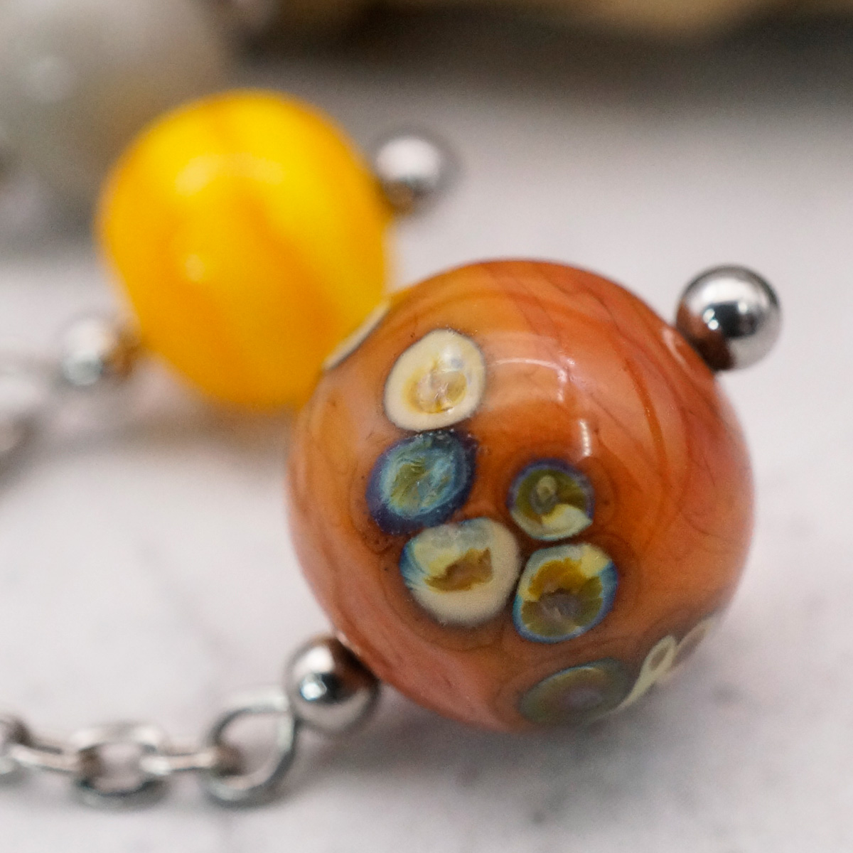 Серьги изготовлены из муранского стекла и гипоаллергенной ювелирной стали, что очень важно для людей с чувствительной кожей. Металл не темнеет и не подвергается воздействиям окружающей среды, надолго обеспечивая красивый внешний вид изделия. Длина серег - 7 см. Диаметр стеклянного шарика - 1 см.  Вес обеих серег - 11 гр.