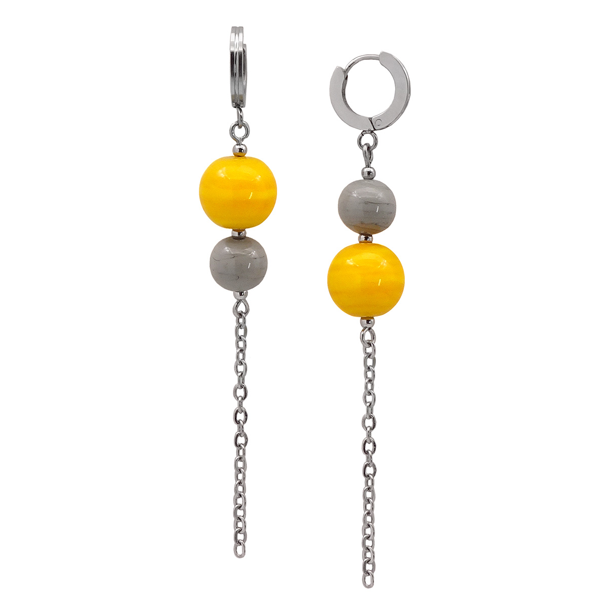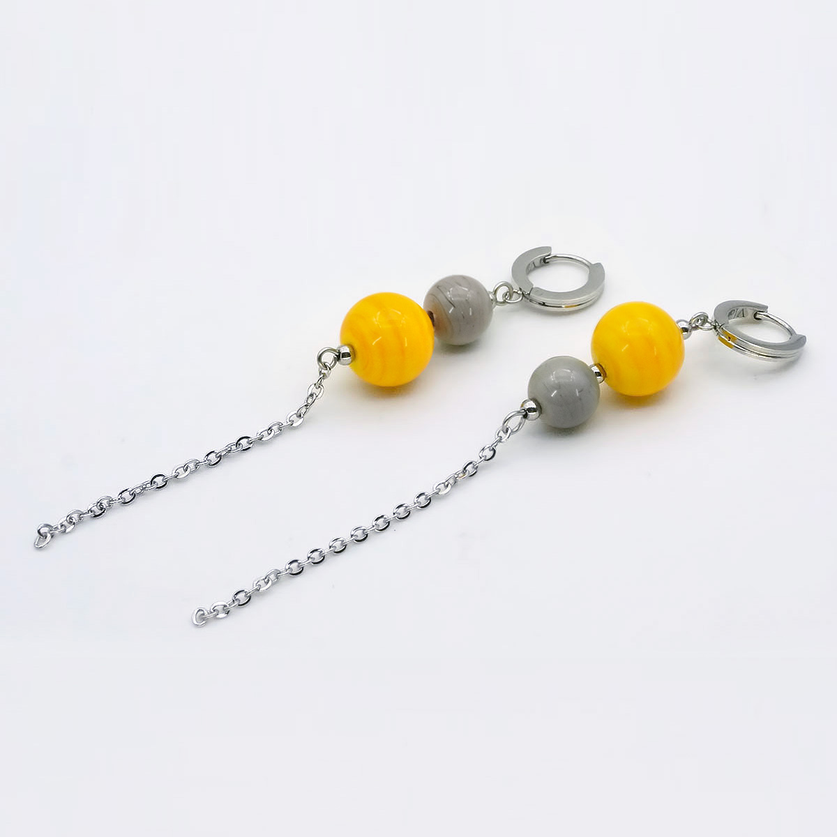 Серьги изготовлены из муранского стекла и гипоаллергенной ювелирной стали, что очень важно для людей с чувствительной кожей. Металл не темнеет и не подвергается воздействиям окружающей среды, надолго обеспечивая красивый внешний вид изделия. Длина серег - 8,5 см. Диаметр стеклянных шариков - 1 и 1,2  см.  Вес обеих серег - 10 гр.
