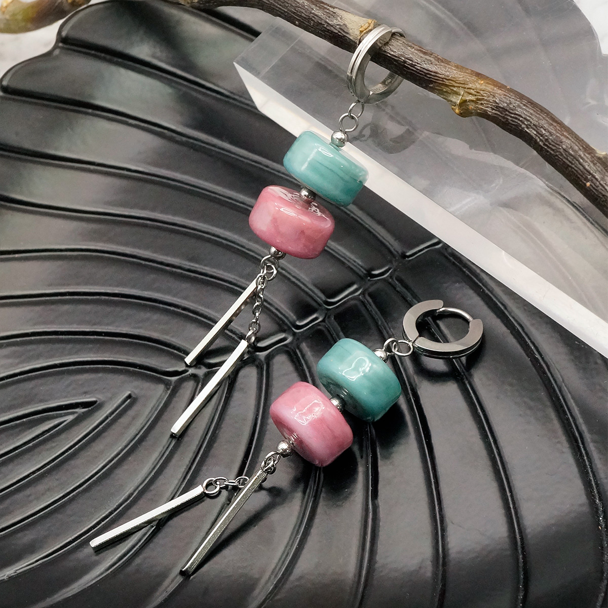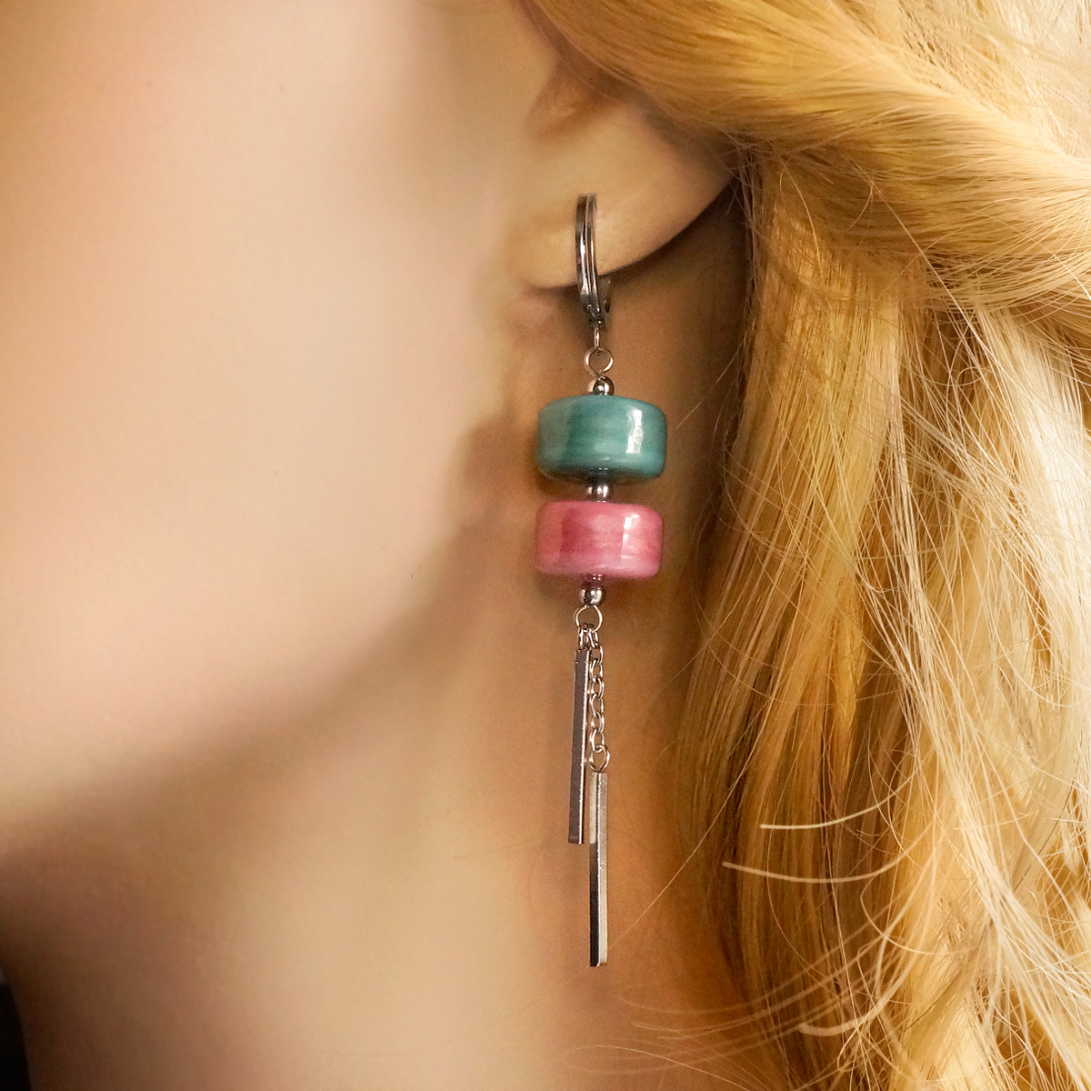Серьги изготовлены из муранского стекла и гипоаллергенной ювелирной стали, что очень важно для людей с чувствительной кожей. Металл не темнеет и не подвергается воздействиям окружающей среды, надолго обеспечивая красивый внешний вид изделия. Размер стеклянных бусин - 0,7*1,3 см. Длина серег - 7 см. Вес обеих серег - 14 г